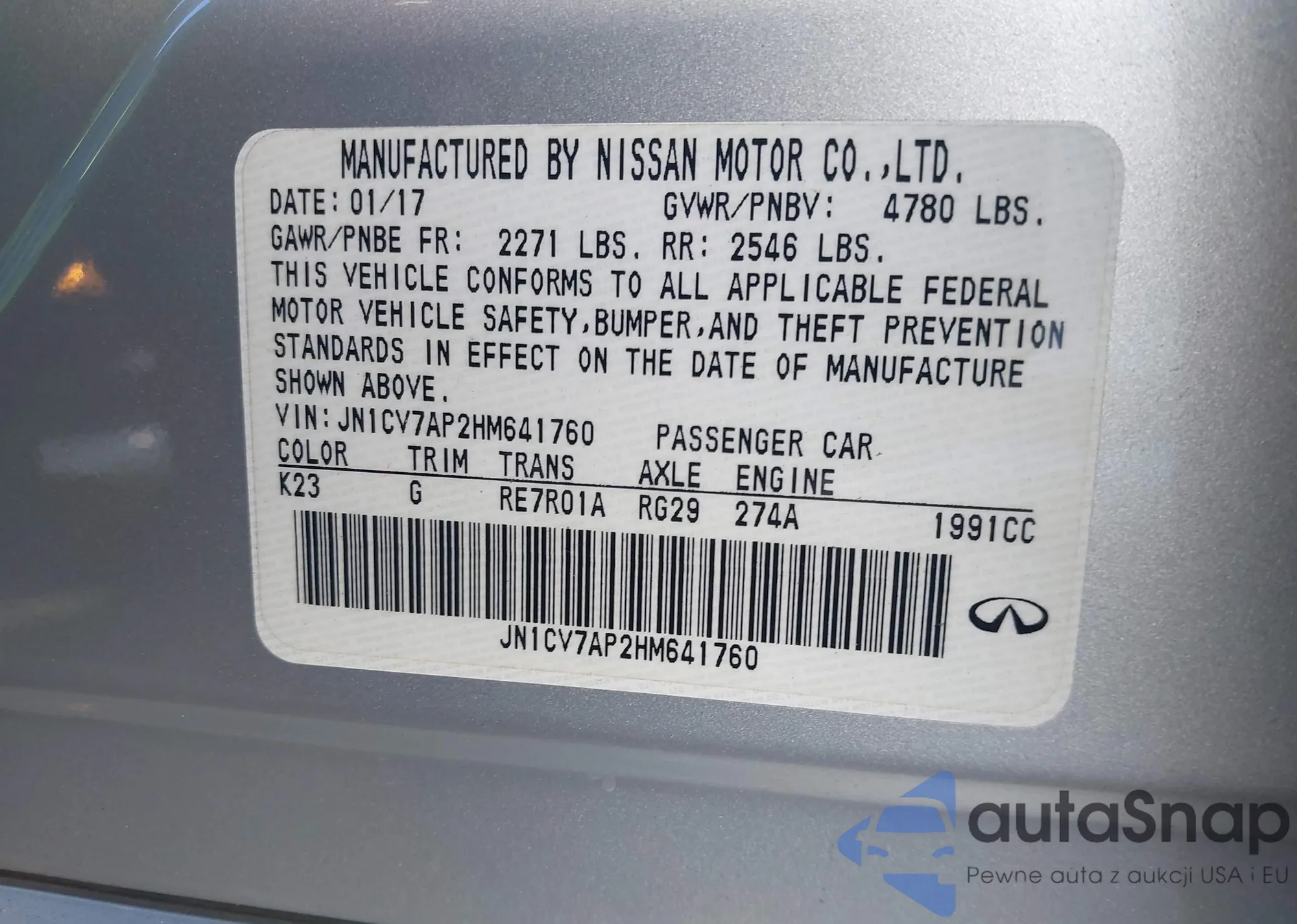 LOT: 43814709 VIN: JN1CV7AP2HM641760