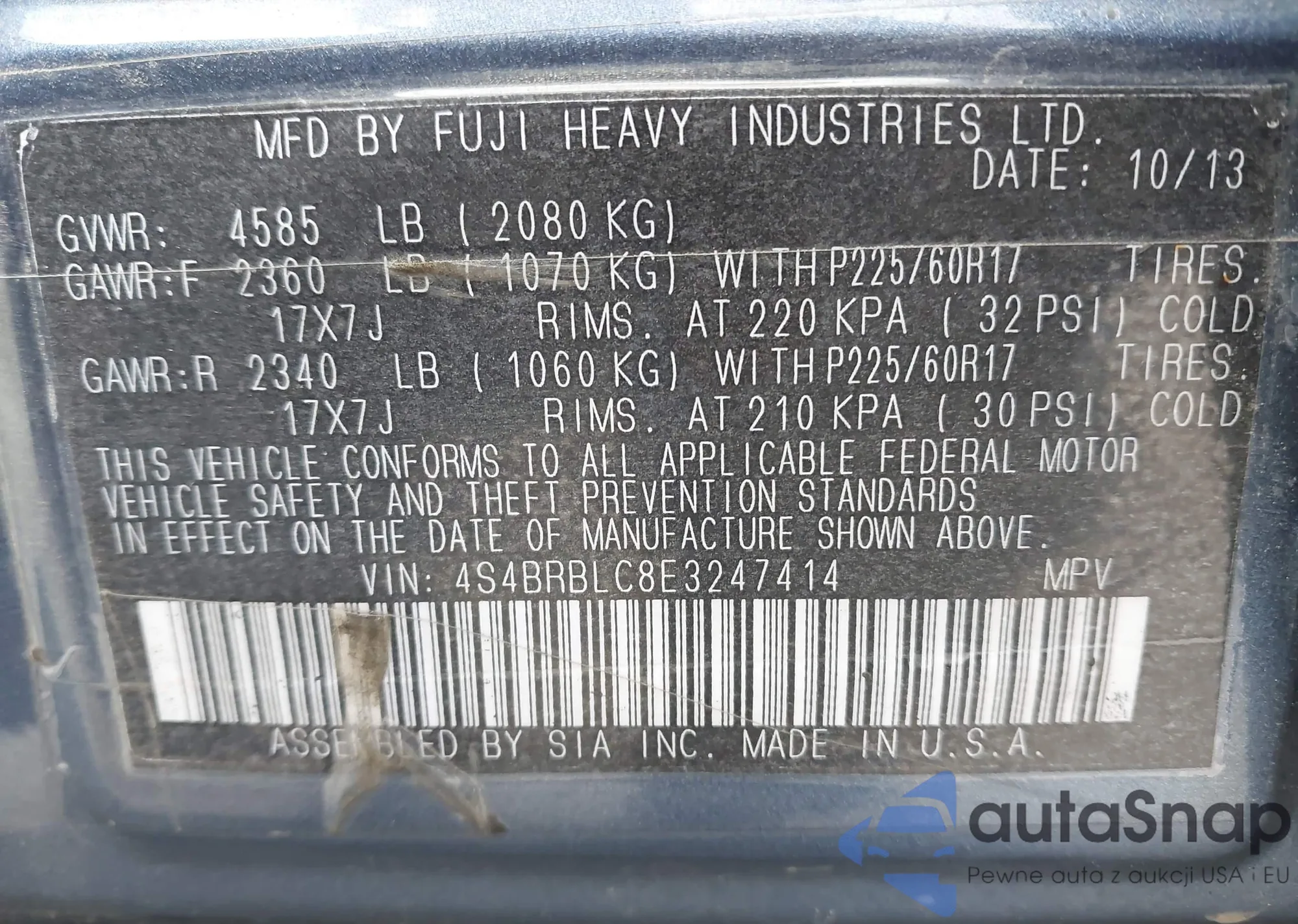 LOT: 43438211 VIN: 4S4BRBLC8E3247414