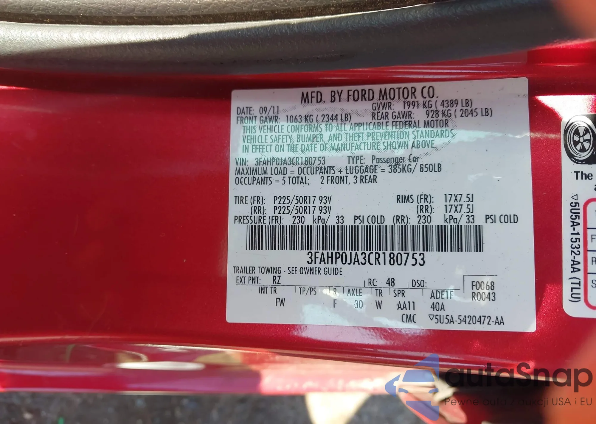 • VIN 3FAHP0JA3CR180753