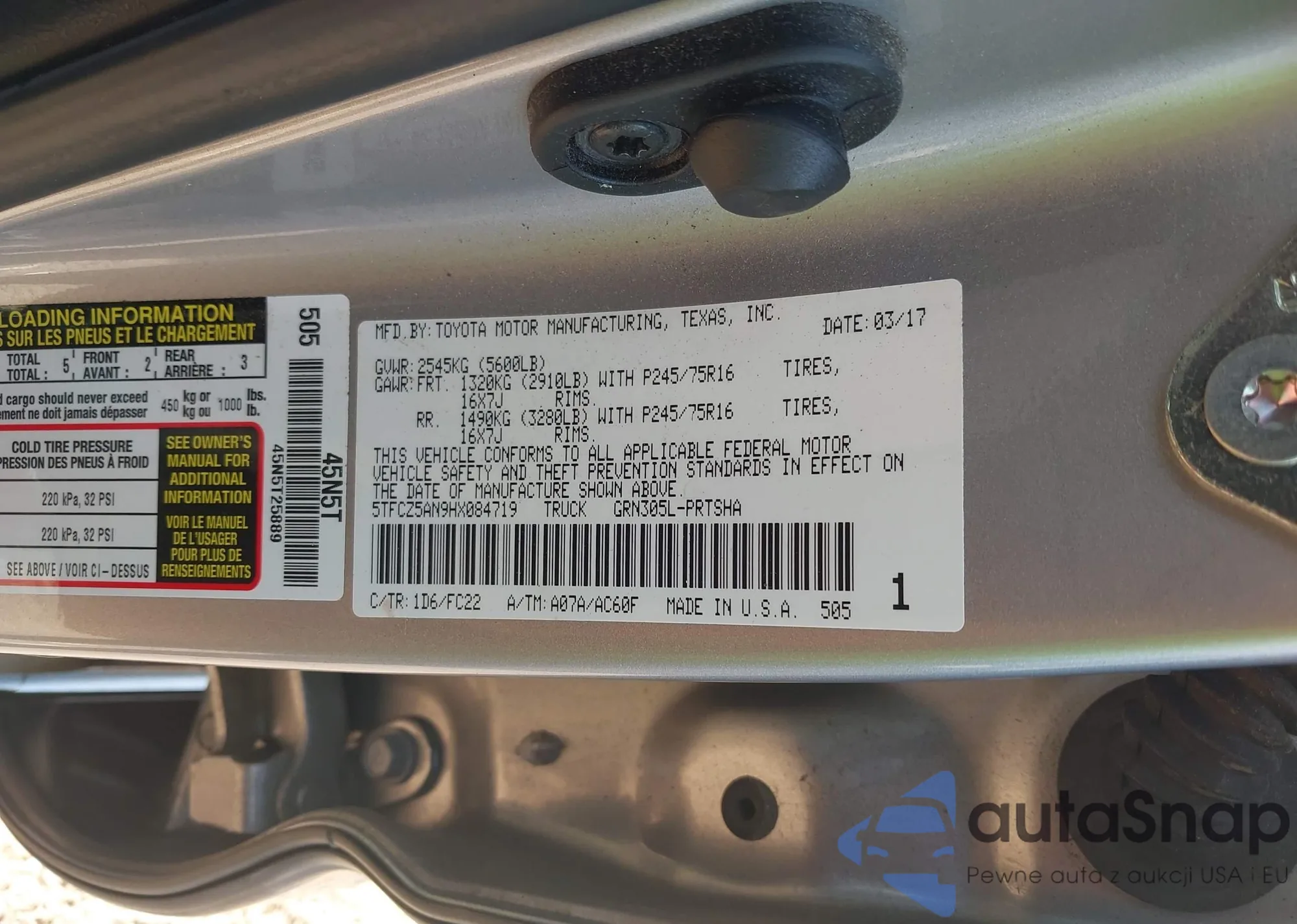 LOT: 43989259 VIN: 5TFCZ5AN9HX084719