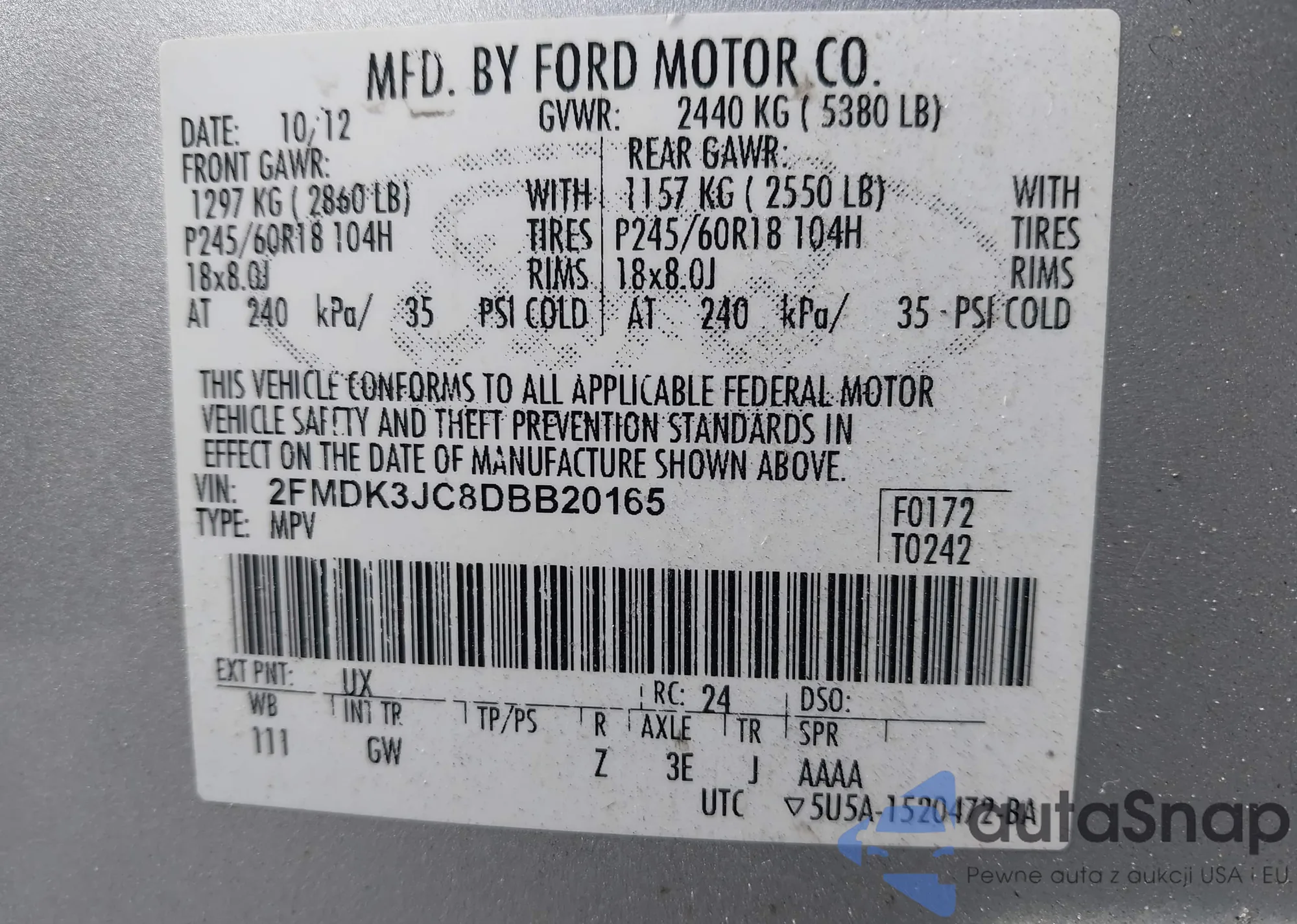 LOT: 44074870 VIN: 2FMDK3JC8DBB20165