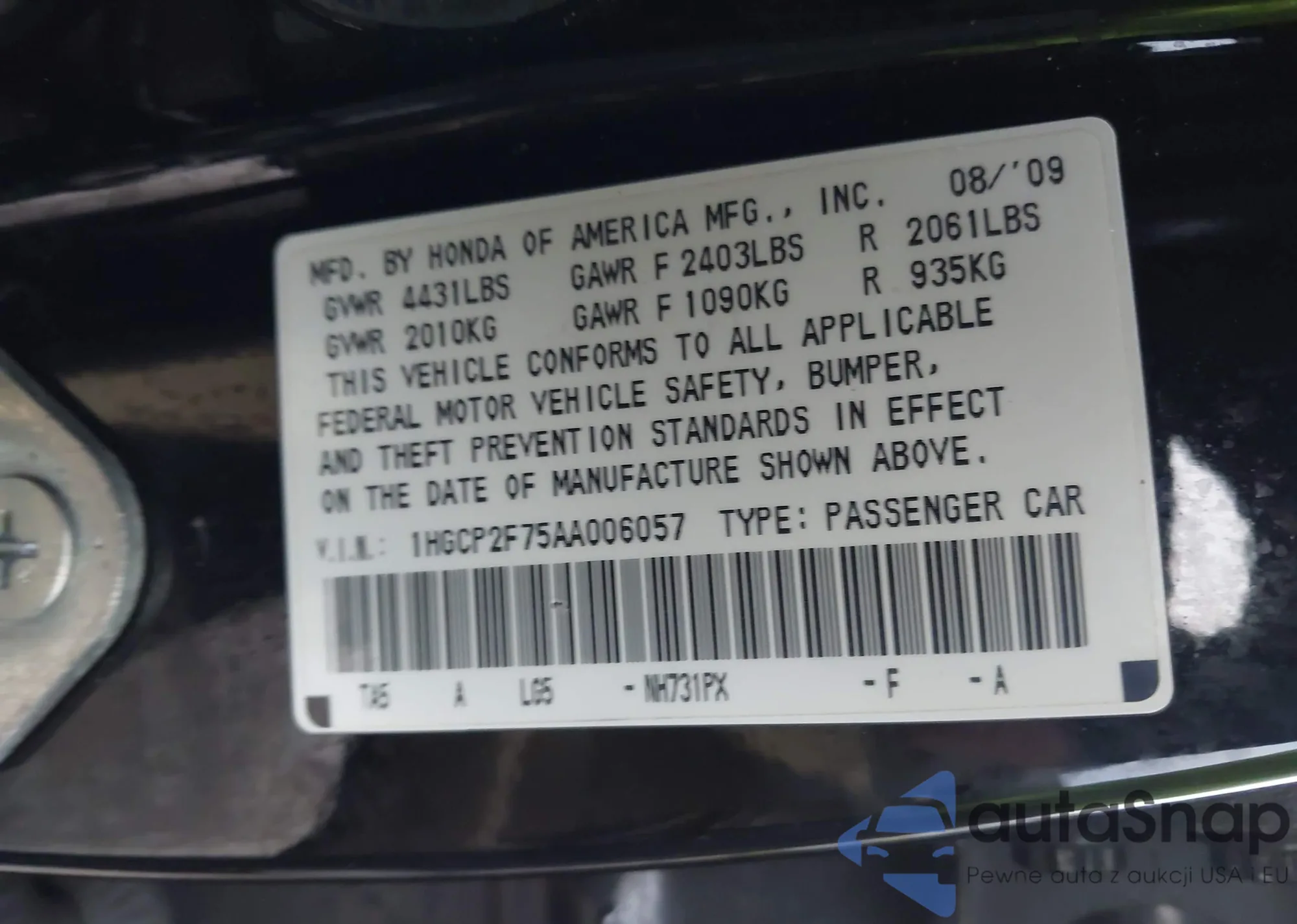• VIN 1HGCP2F75AA006057