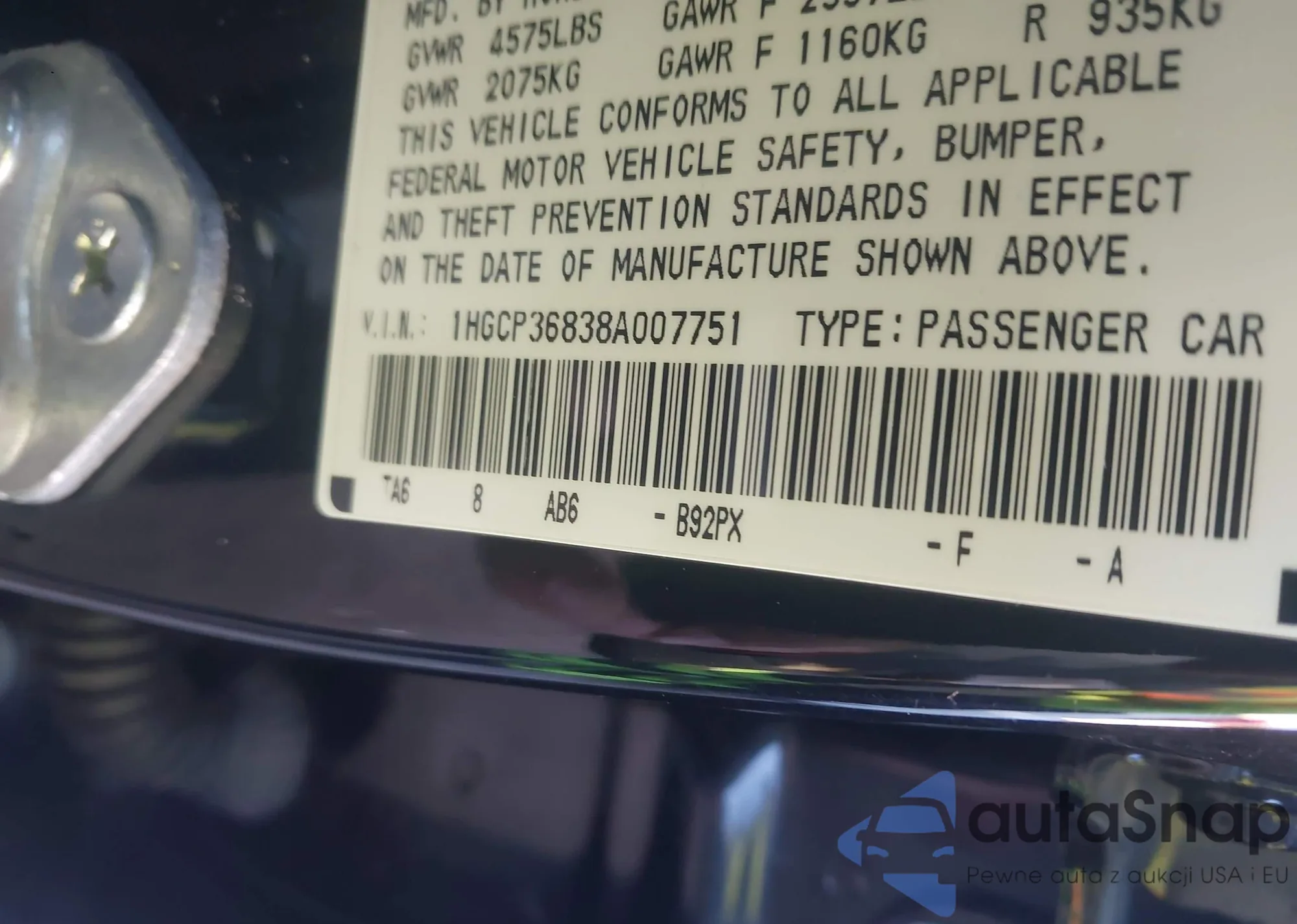 LOT: 44080671 VIN: 1HGCP2F75AA006057