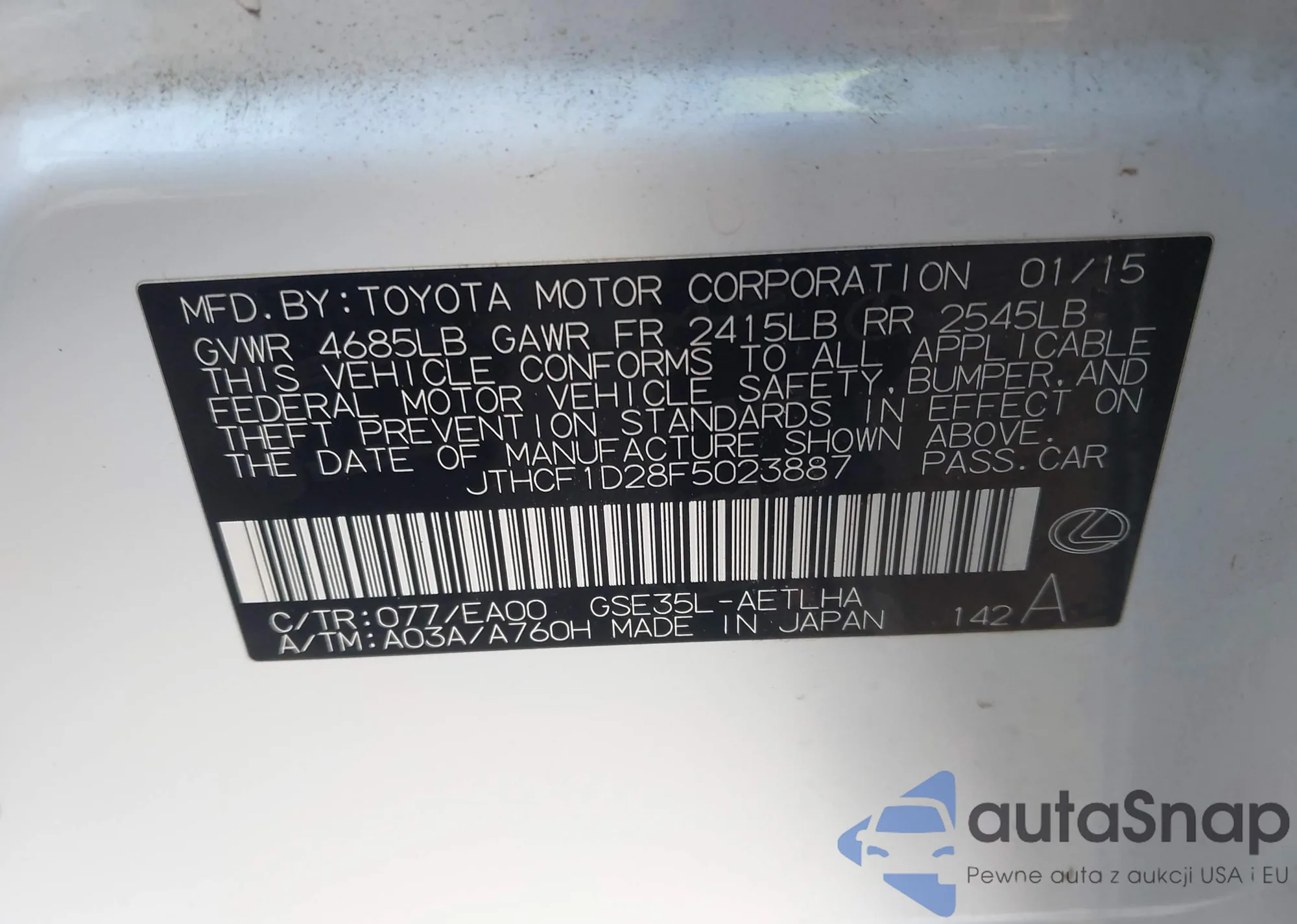 LOT: 43829045 VIN: JTHCF1D28F5023887