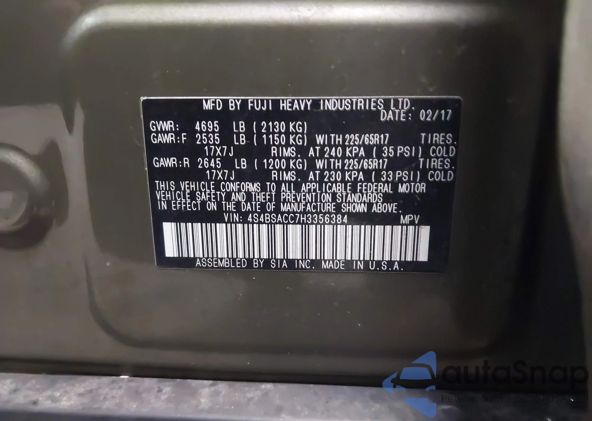 LOT: 43751346 VIN: 4S4BSACC7H3356384