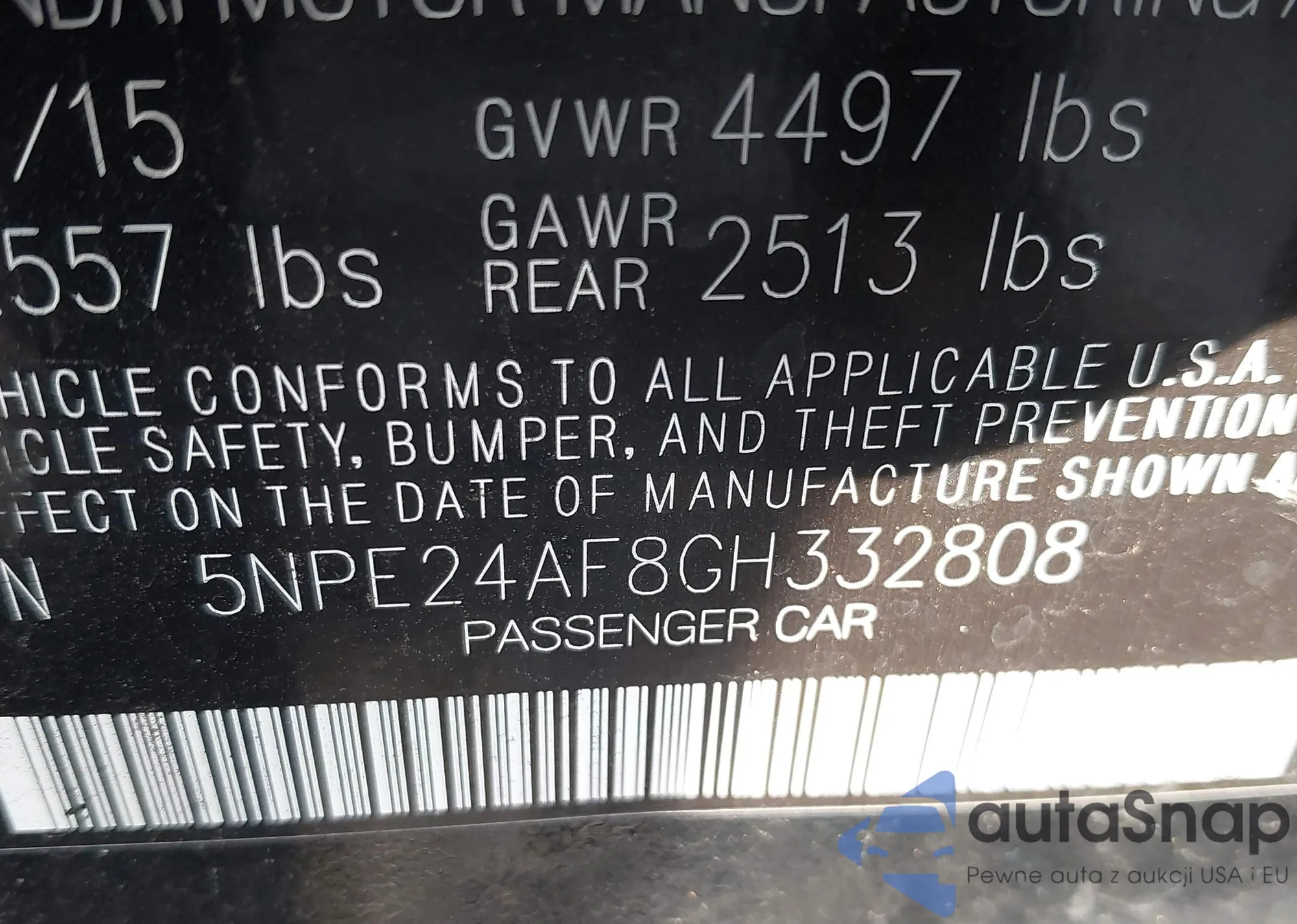 LOT: 43805457 VIN: 5NPE24AF8GH332808