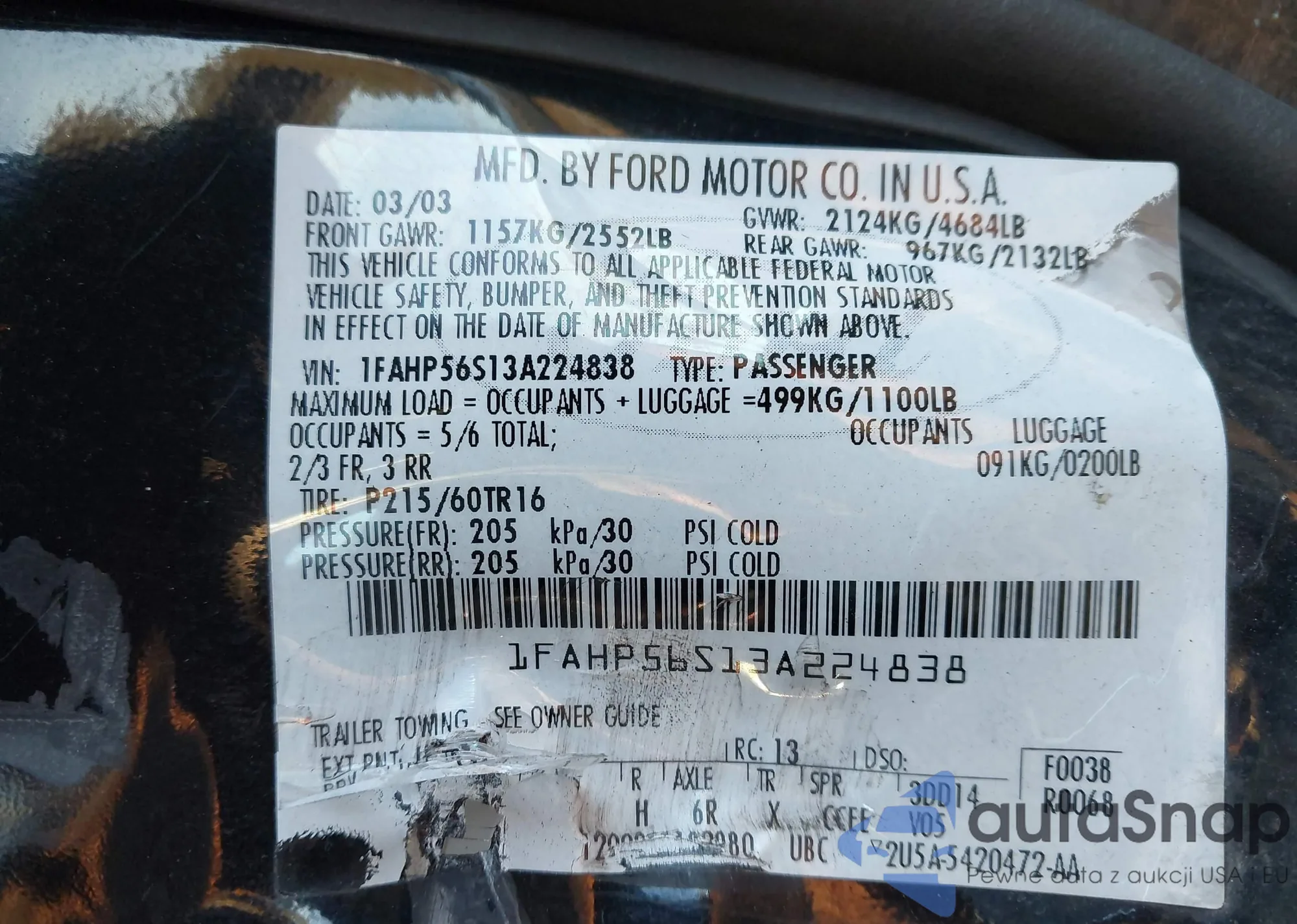 • VIN 1FAHP56S13A224838