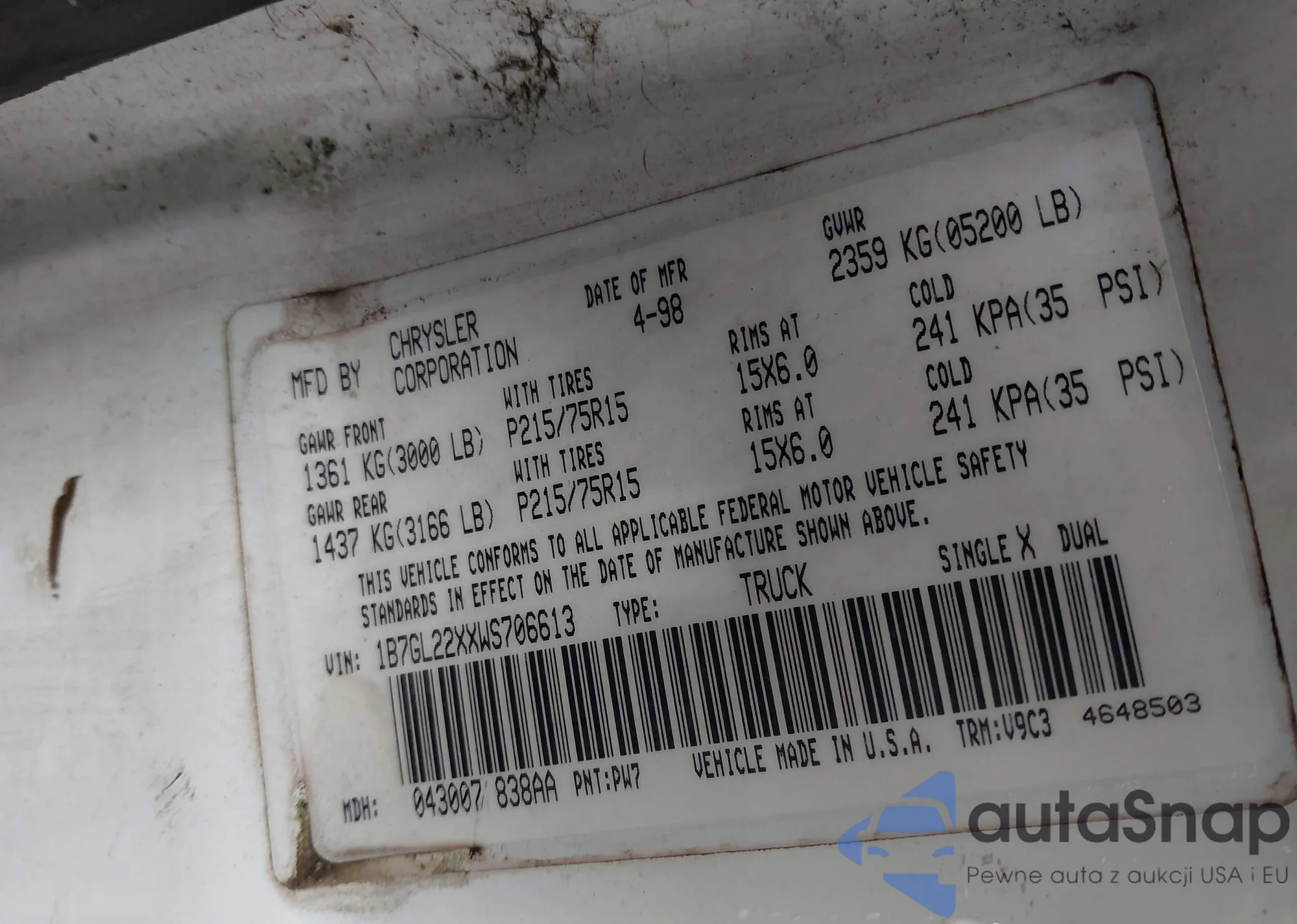 • VIN 1B7GL22XXWS706613