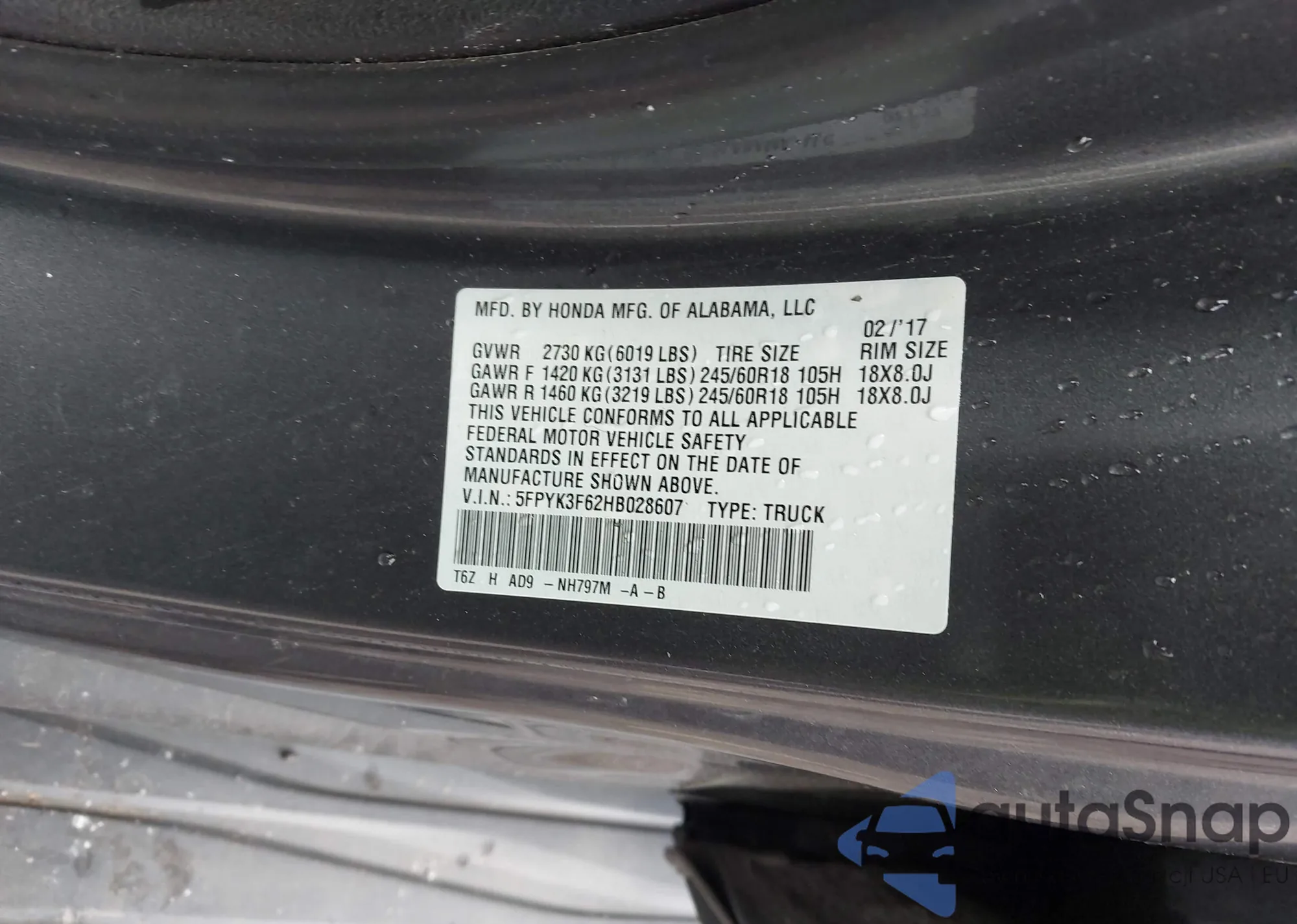 • VIN 5FPYK3F62HB028607