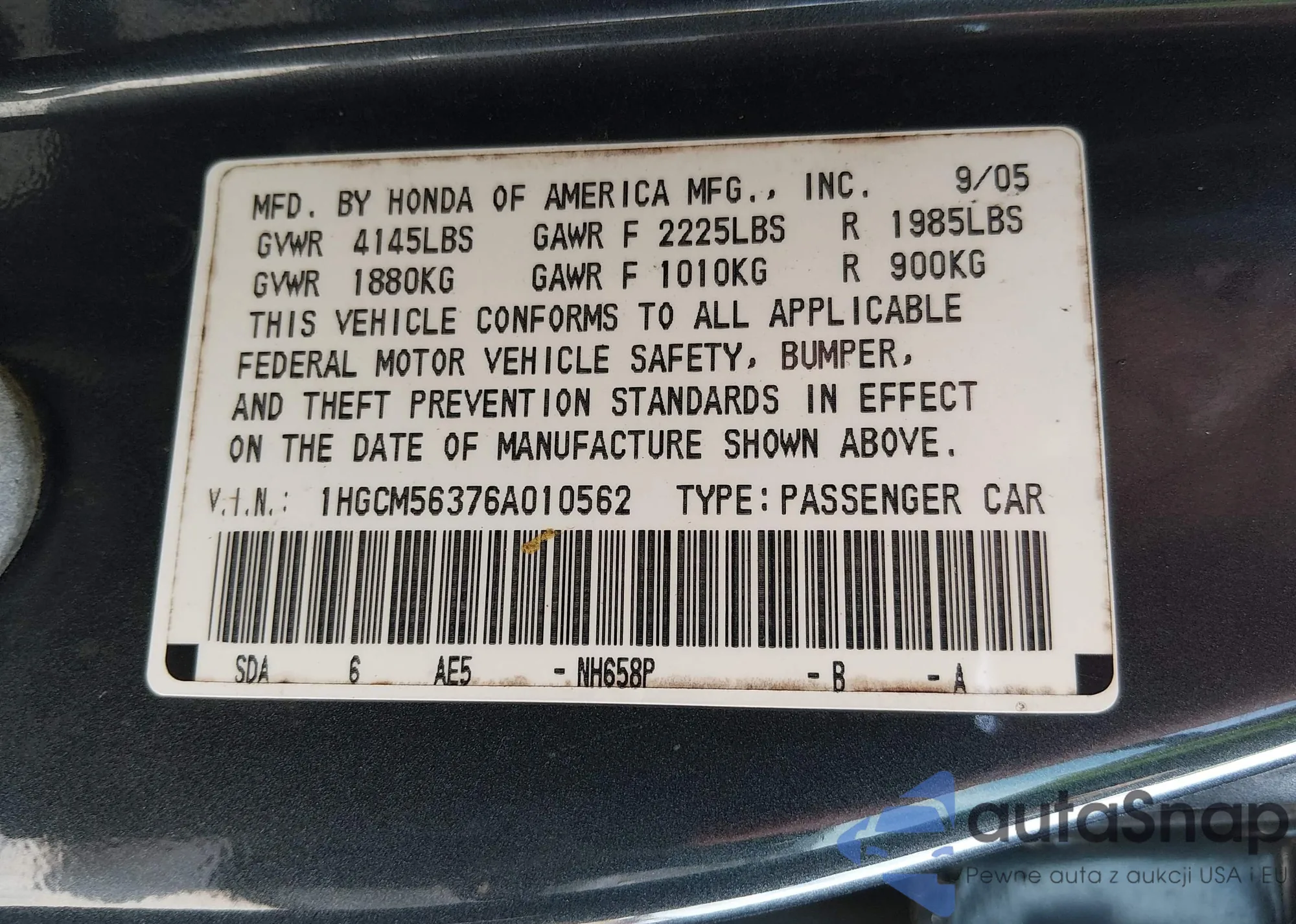 LOT: 43707335 VIN: 1HGCM56376A010562