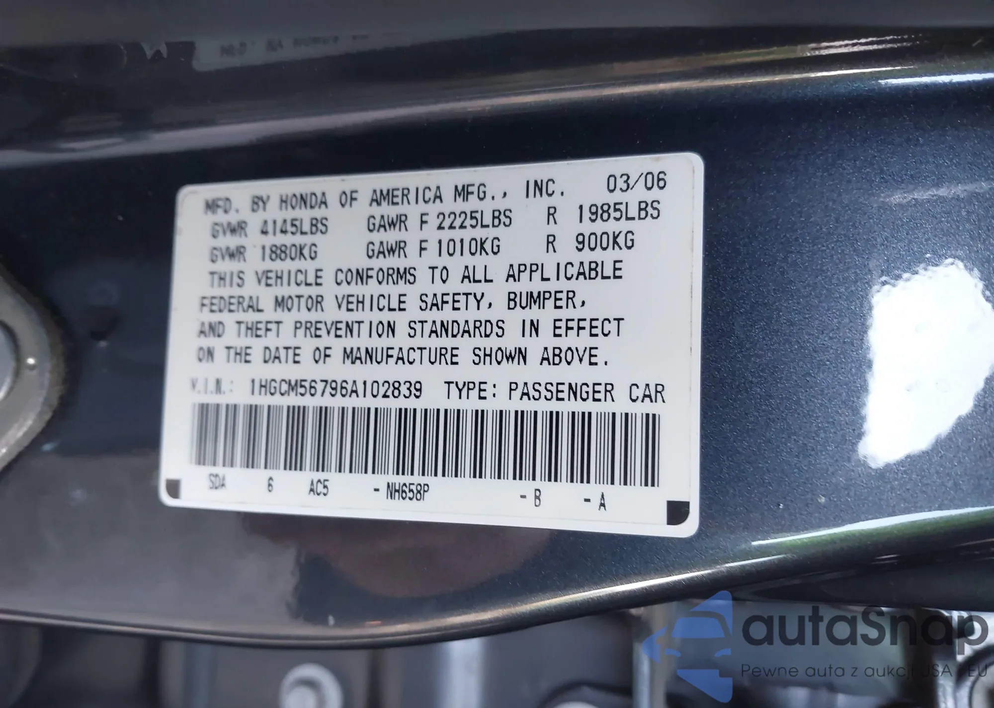 LOT: 43798886 VIN: 1HGCM56796A102839