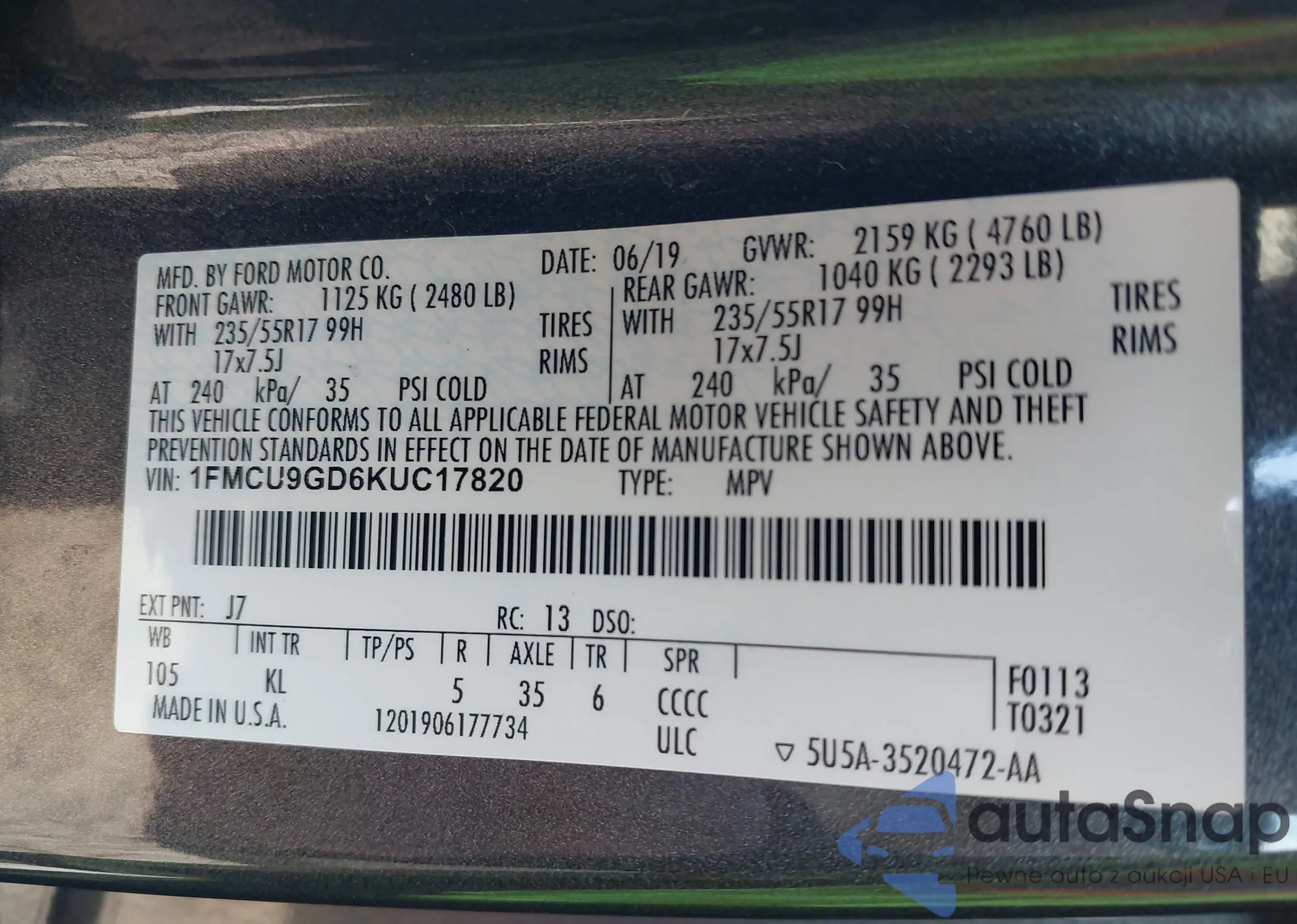• VIN 1FMCU9GD6KUC17820