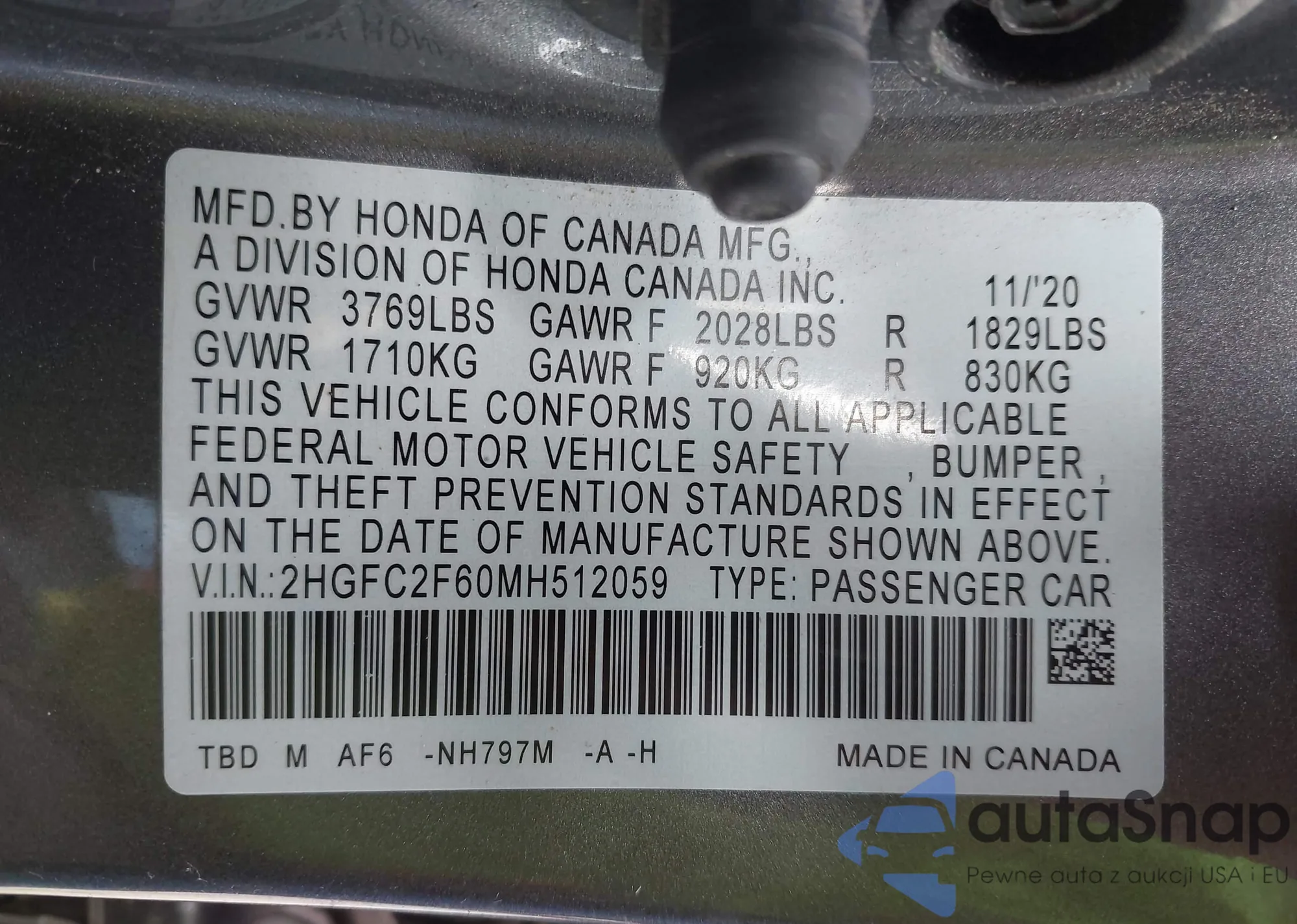 LOT: 43519231 VIN: 2HGFC2F60MH512059