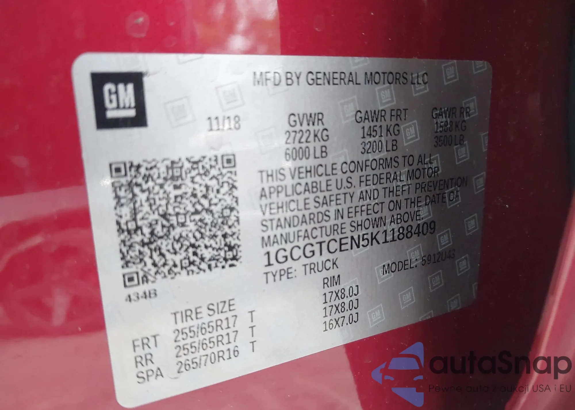 LOT: 43880545 VIN: 1GCGTCEN5K1188409
