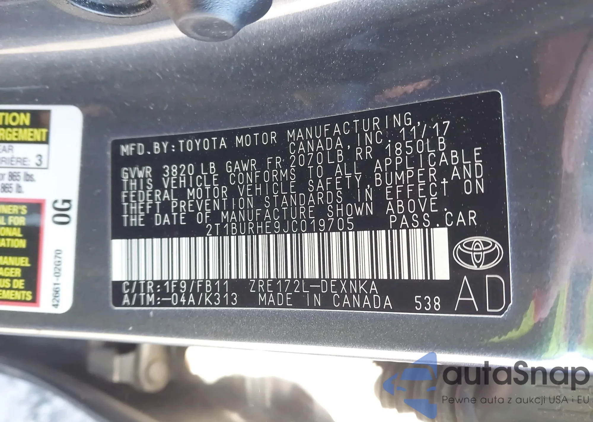 LOT: 43897470 VIN: 2T1BURHE9JC019705