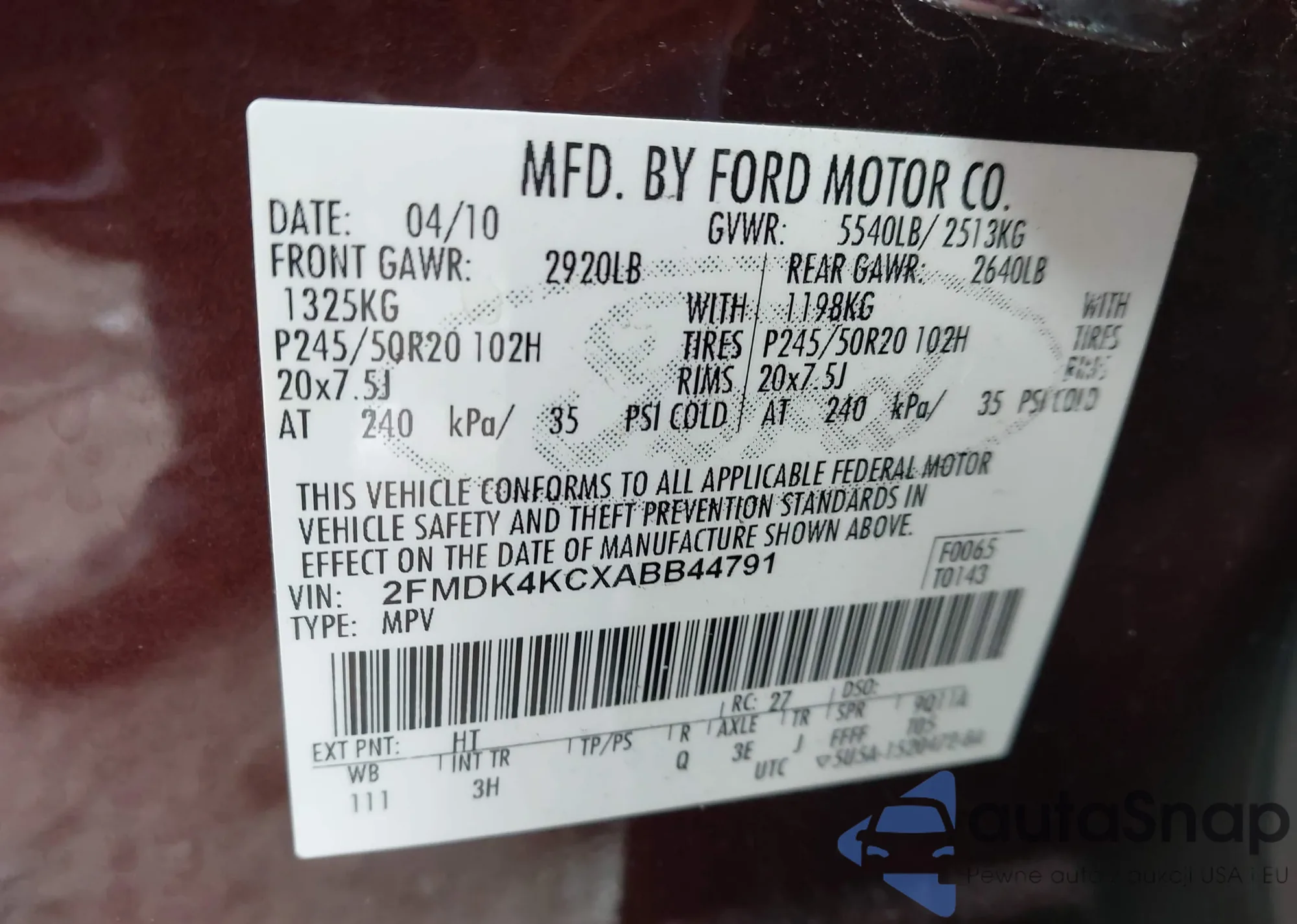 • VIN 2FMDK4KCXABB44791