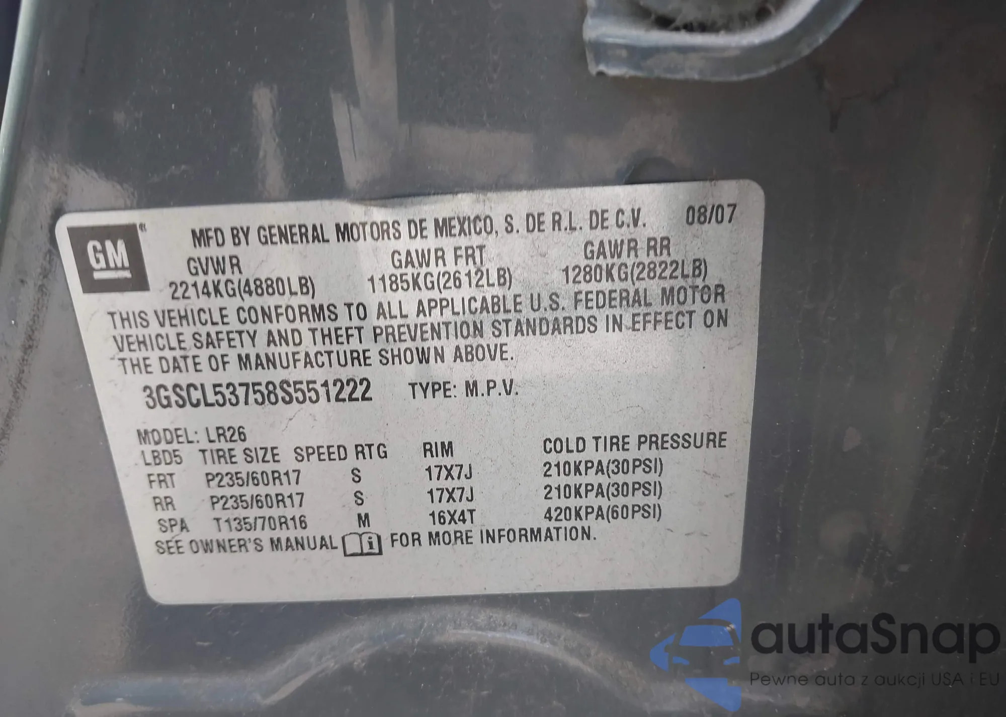 • VIN 3GSCL53758S551222