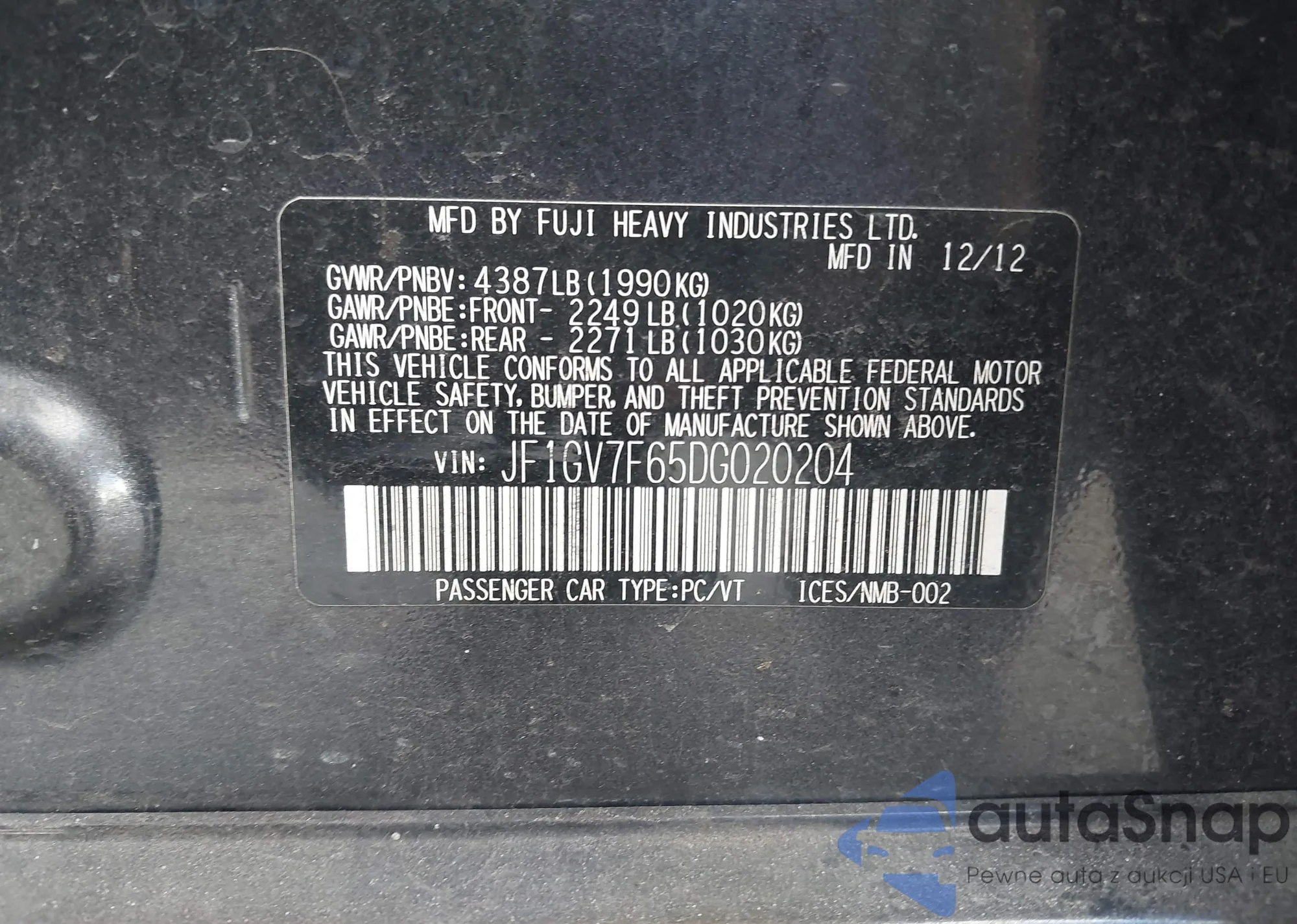 LOT: 43977141 VIN: JF1GV7F65DG020204