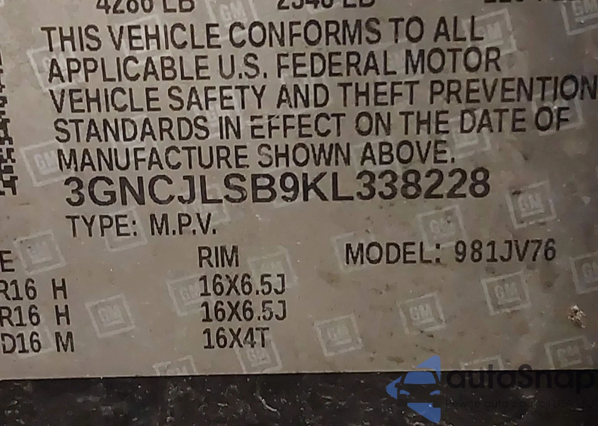• VIN 3GNCJLSB9KL338228