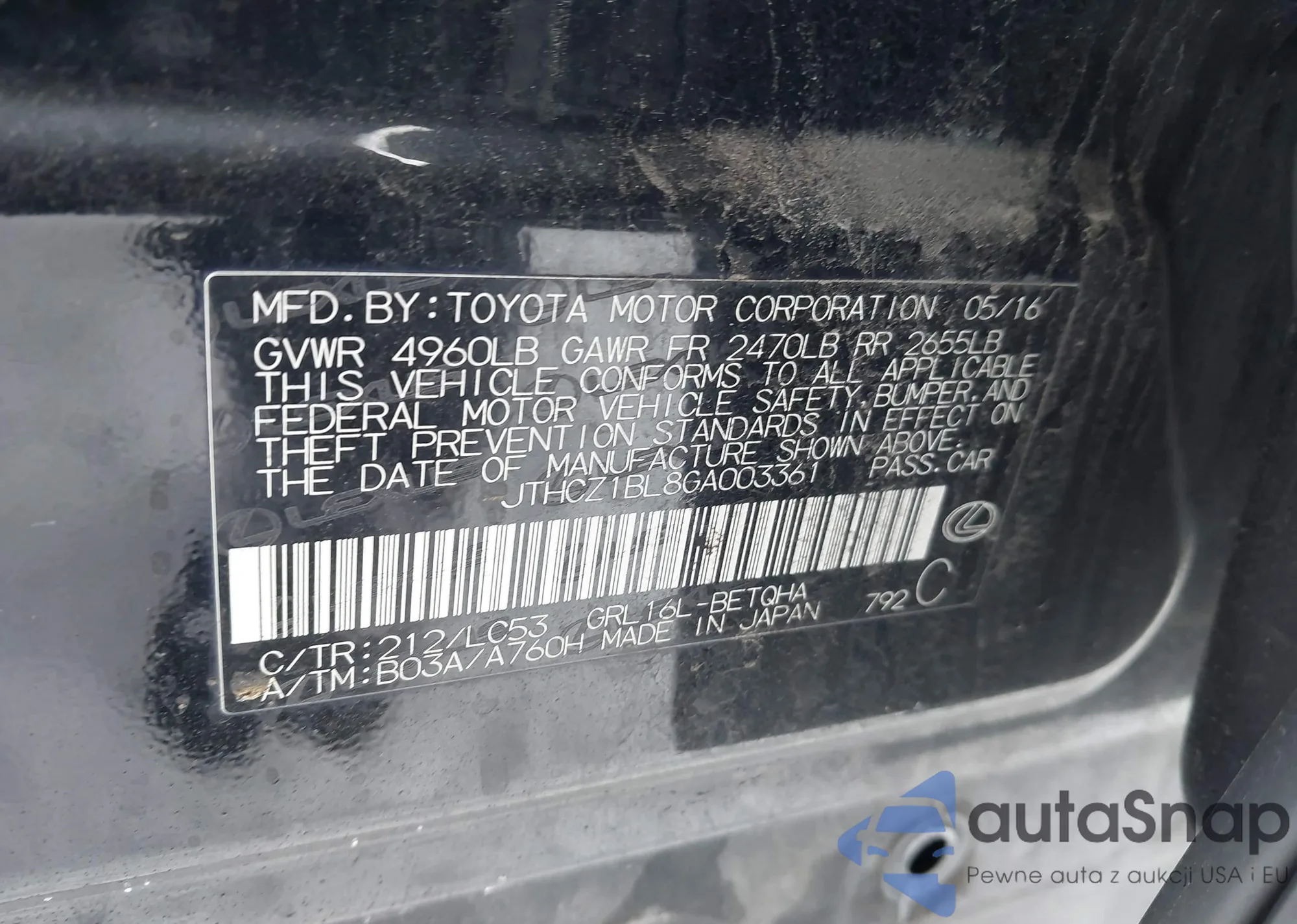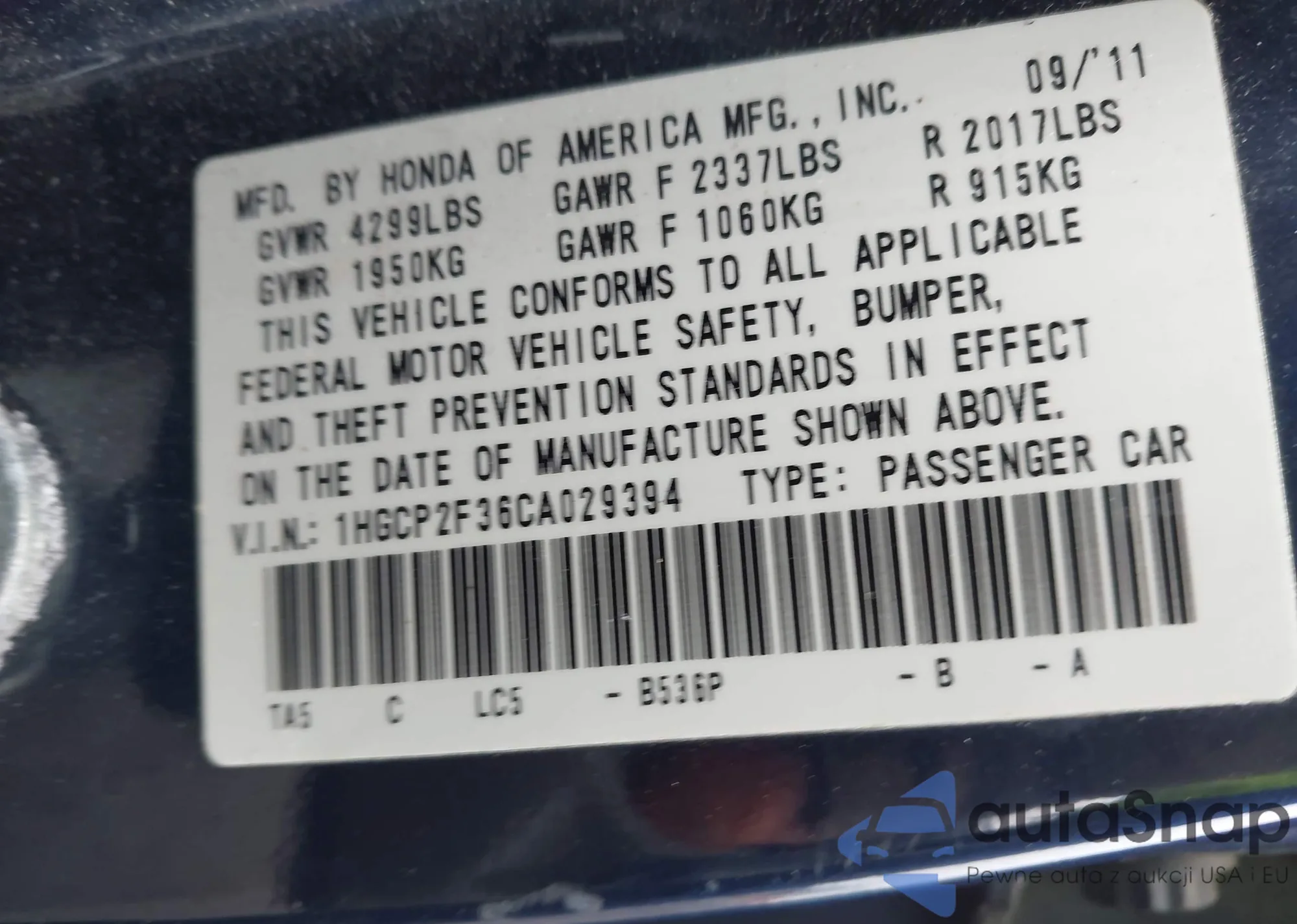 LOT: 44064941 VIN: 1HGCP2F36CA029394