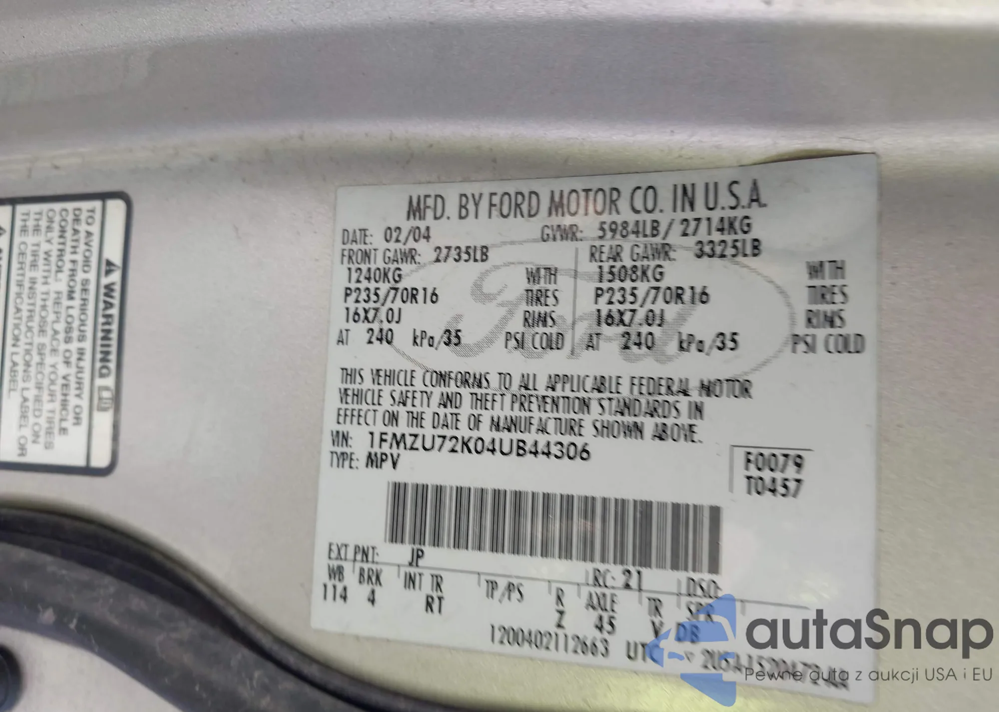 • VIN 1FMZU72K04UB44306