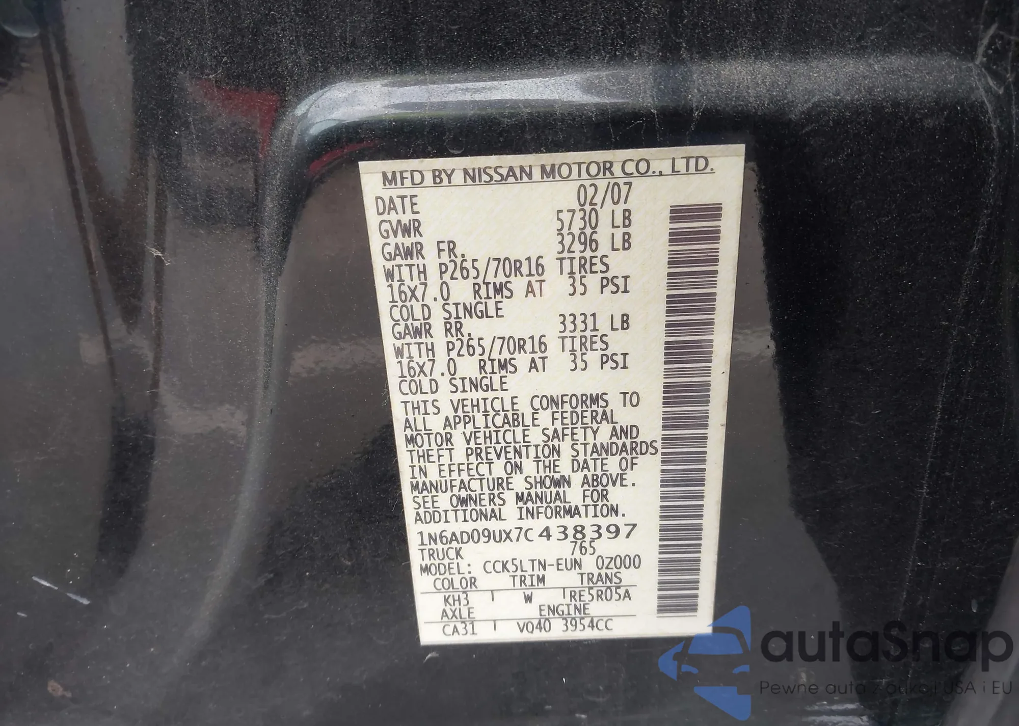 • VIN 1N6AD09UX7C438397