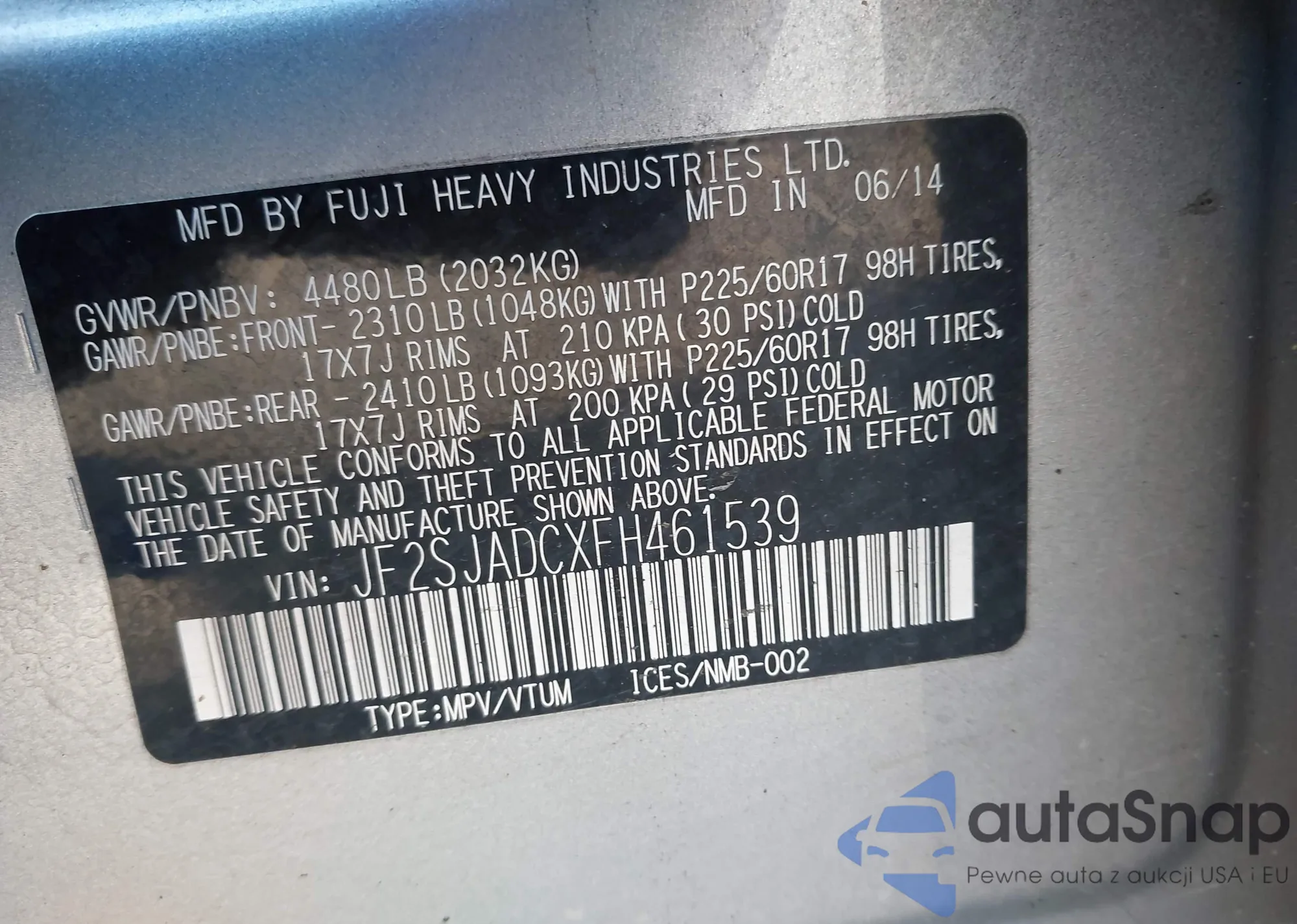 • VIN JF2SJADCXFH461539