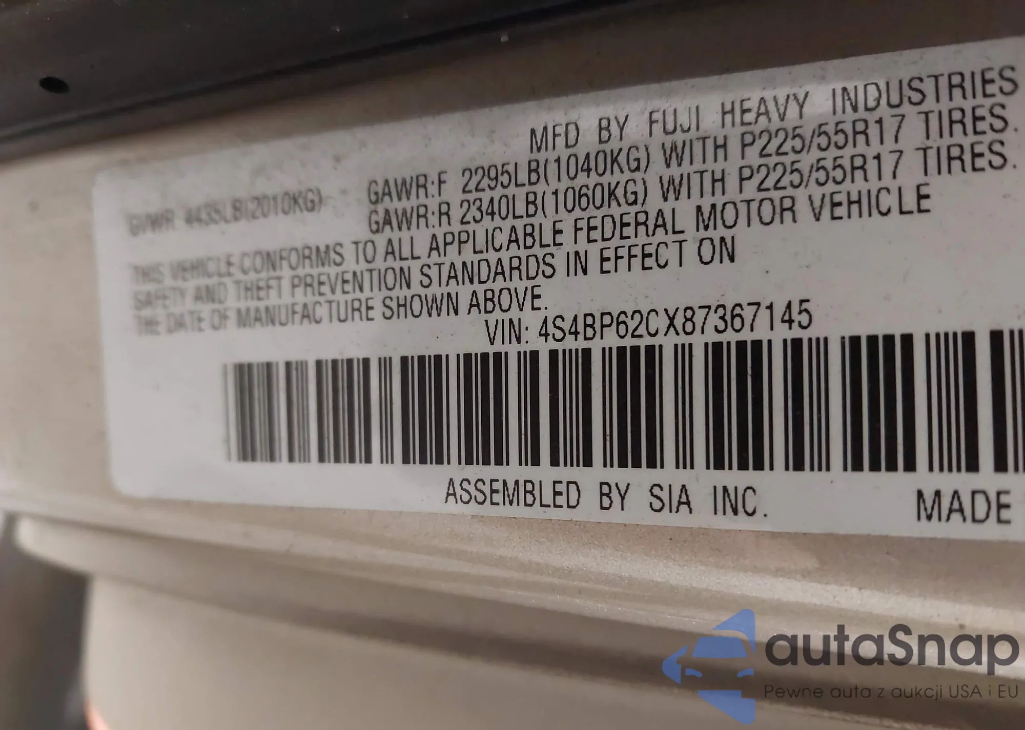 • VIN 4S4BP62CX87367145