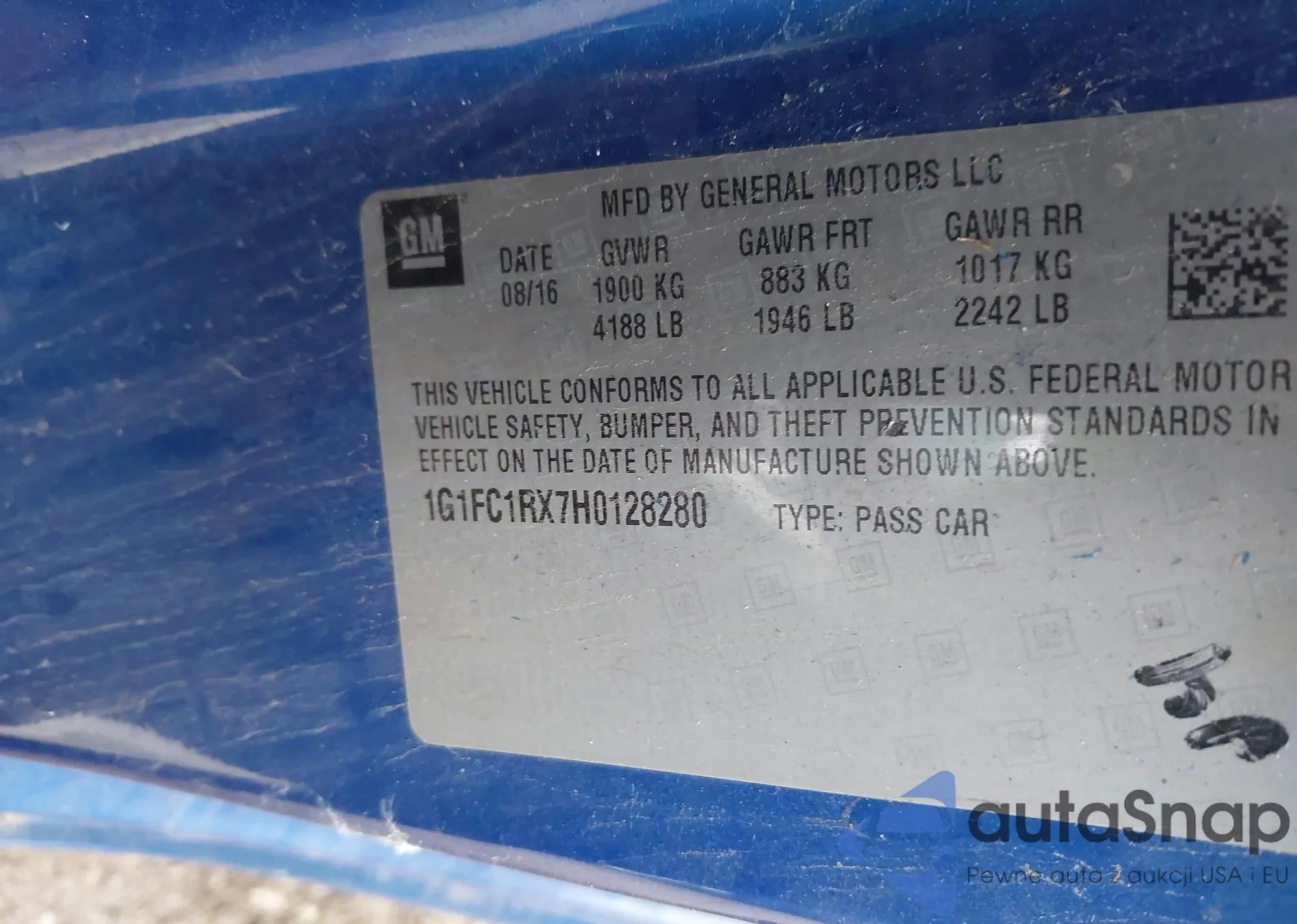 LOT: 43705607 VIN: 1G1FC1RX7H0128280