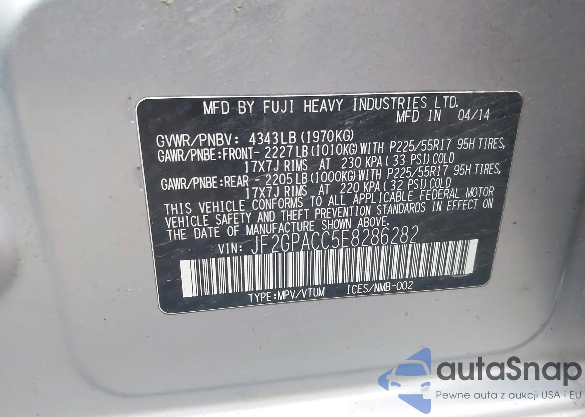 LOT: 43802965 VIN: JF2GPACC5E8286282