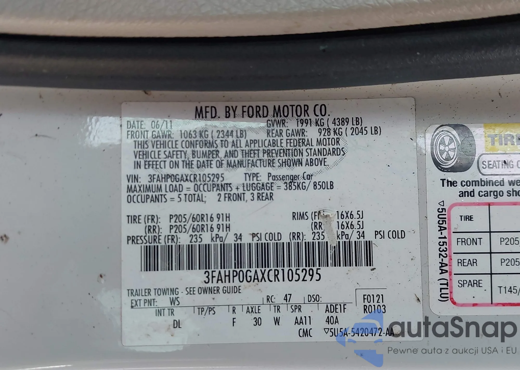 LOT: 43780802 VIN: 3FAHP0GAXCR105295