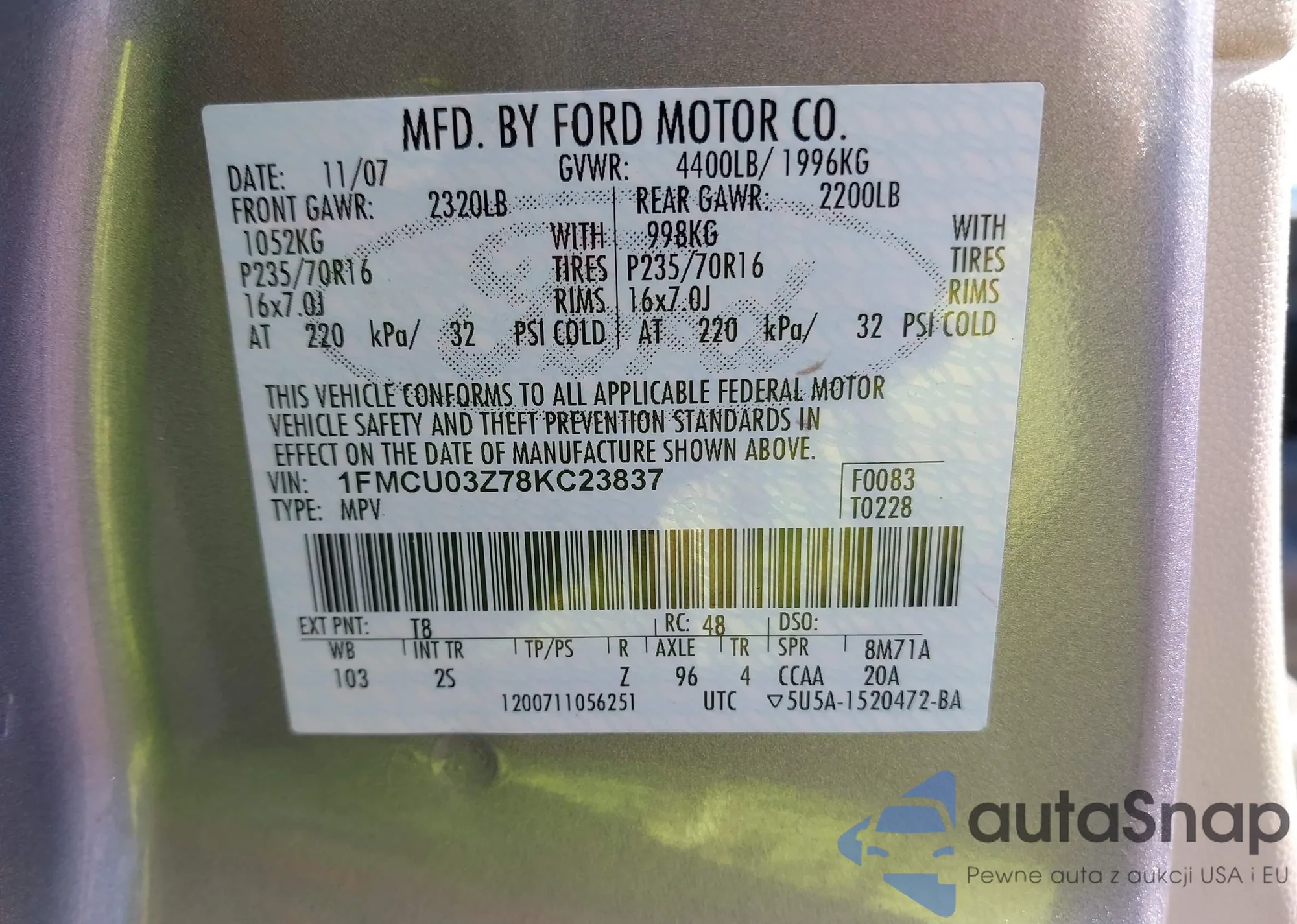 LOT: 43314249 VIN: 1FMCU03Z78KC23837