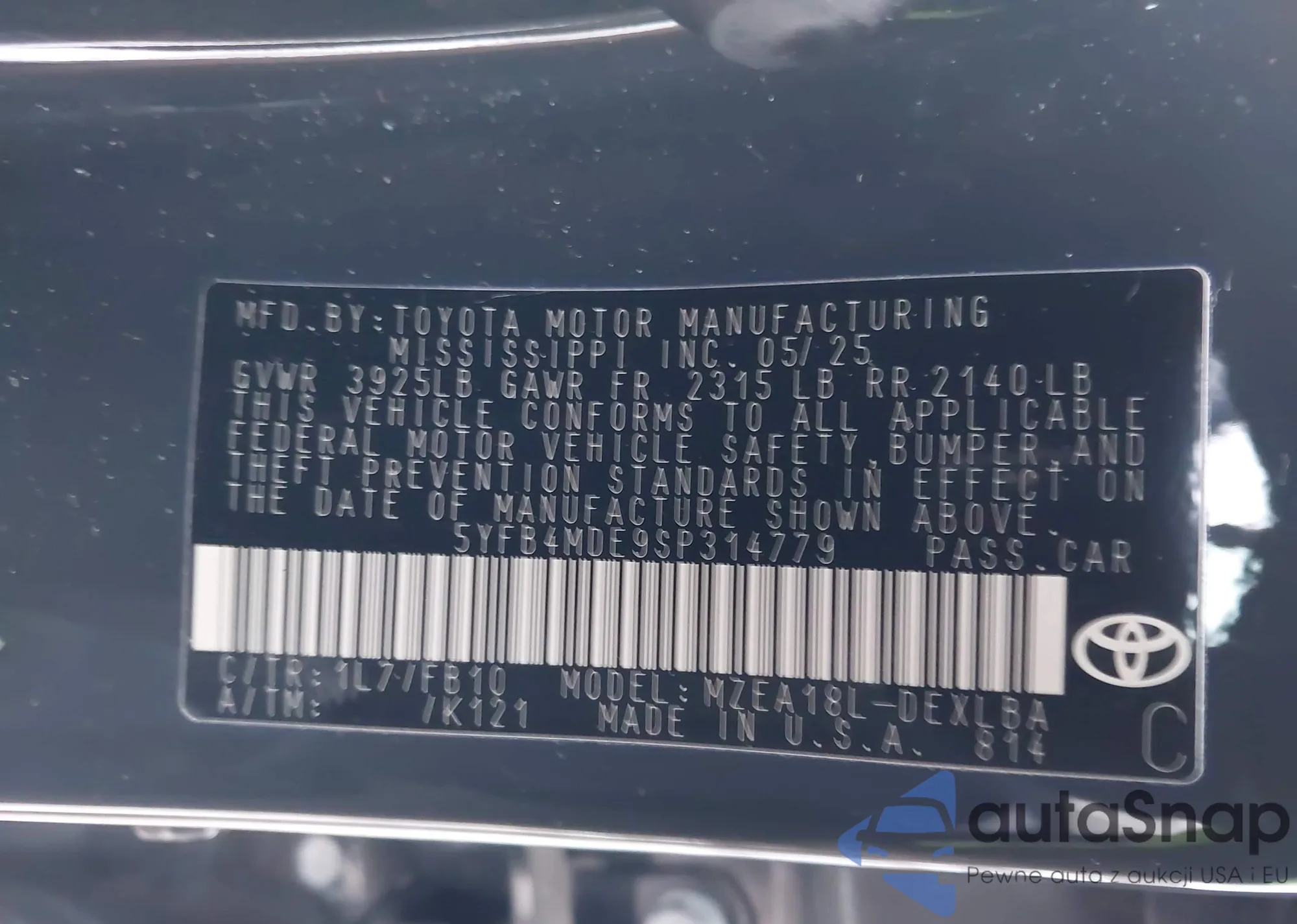 • VIN 5YFB4MDE9SP314779