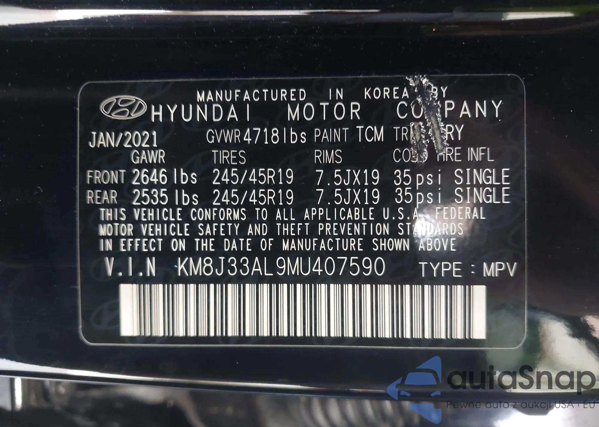 • VIN KM8J33AL9MU407590