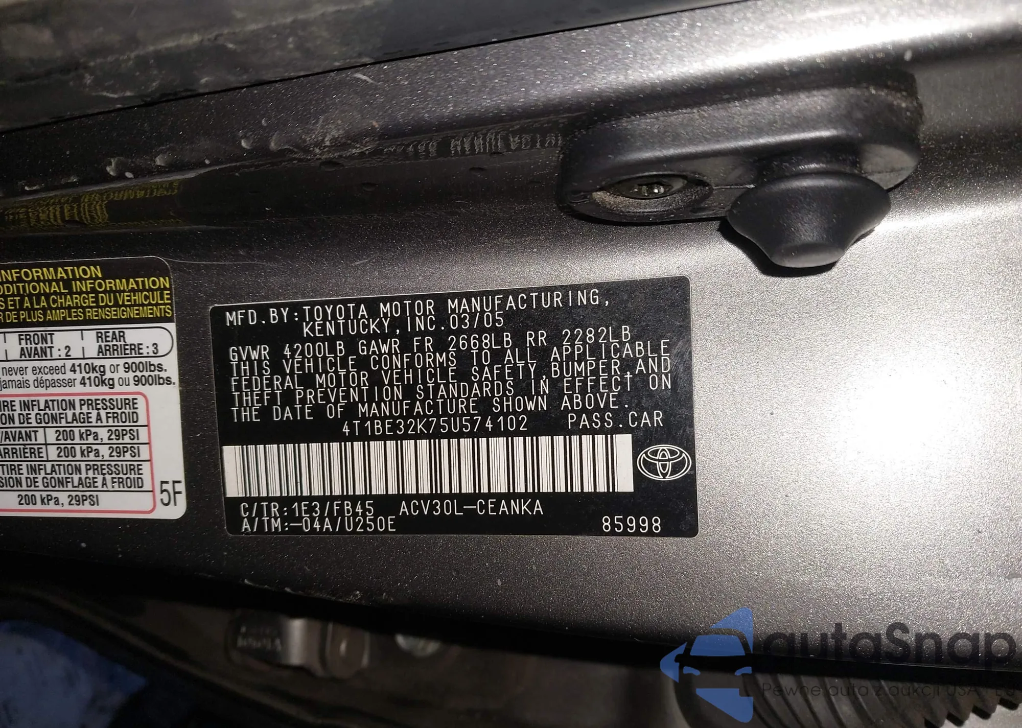 LOT: 43868255 VIN: 4T1BE32K75U574102