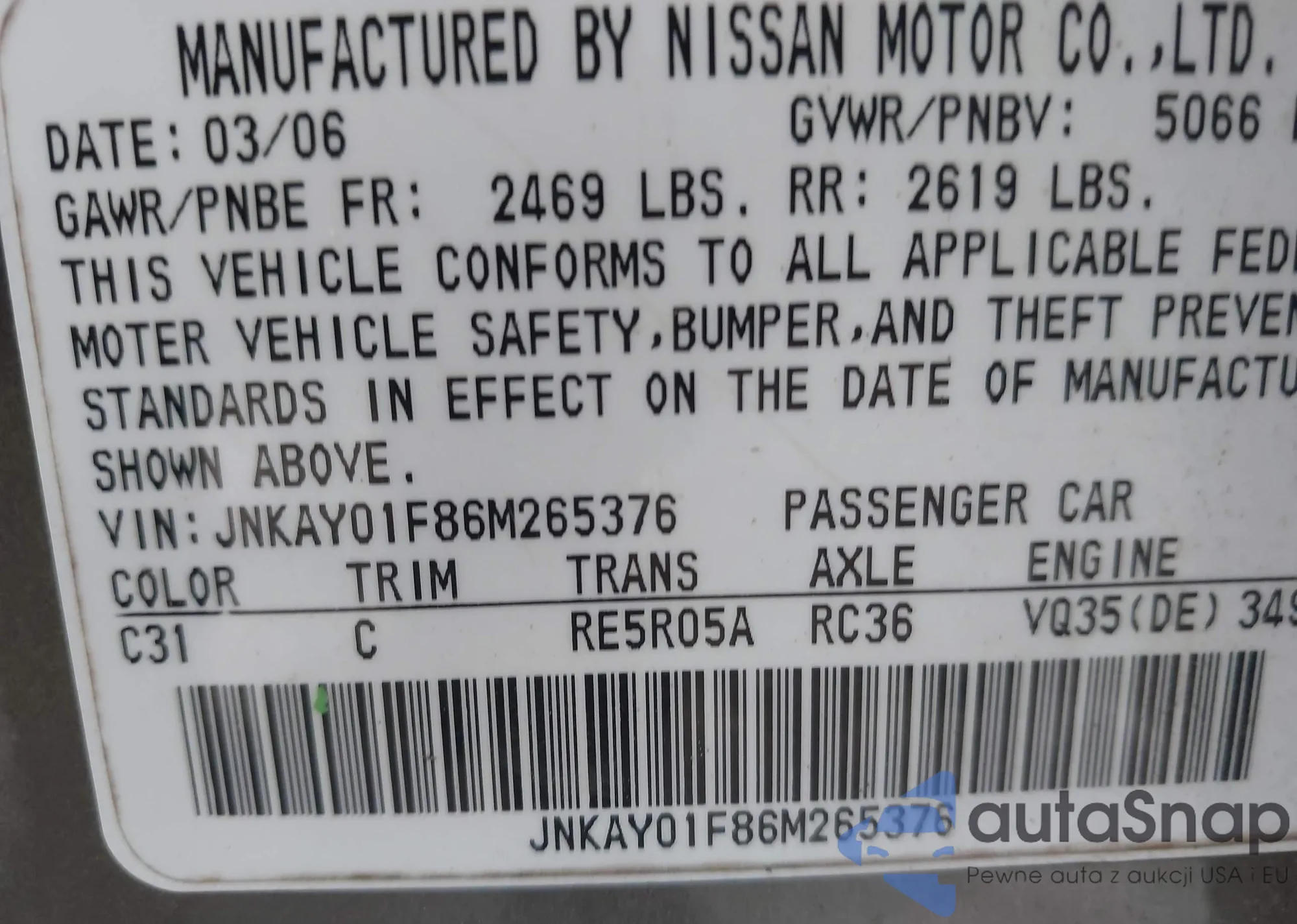 • VIN 1N4AA5AP6DC821169