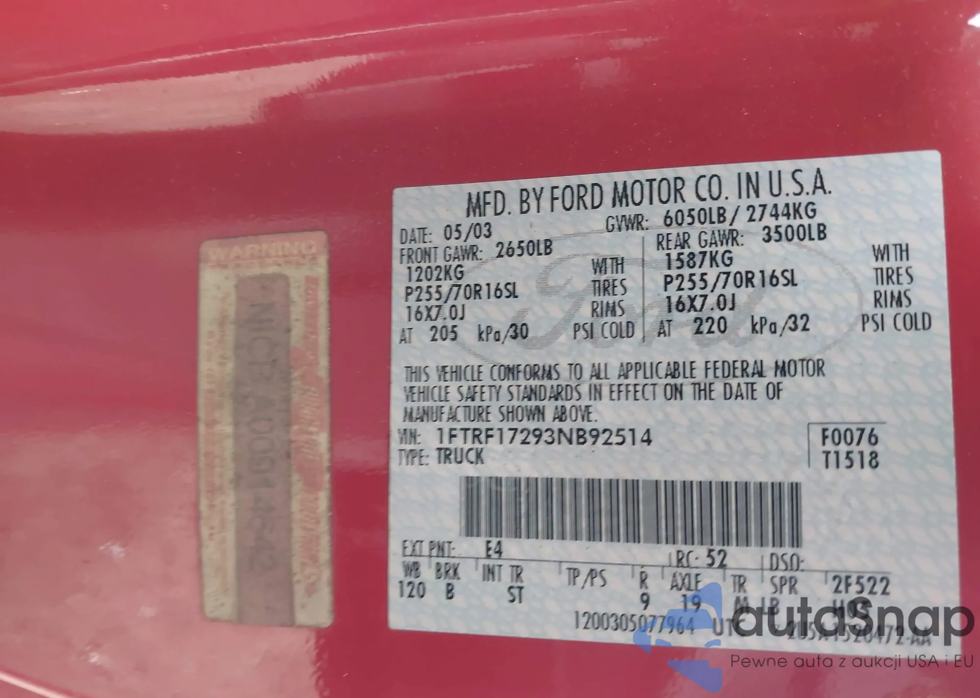 LOT: 44220446 VIN: 1FTRF17293NB92514