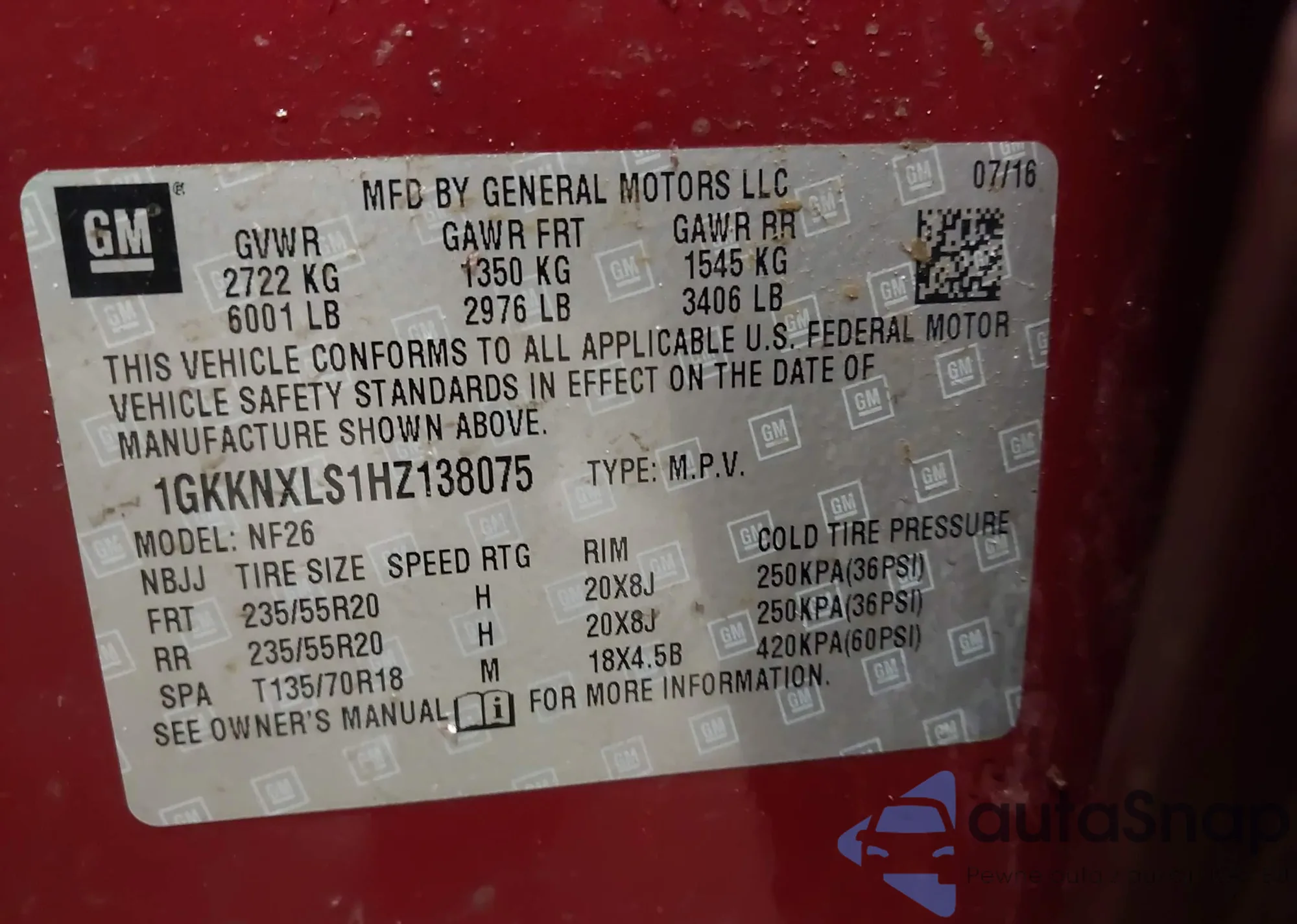 LOT: 43899185 VIN: 1GKKNXLS1HZ138075