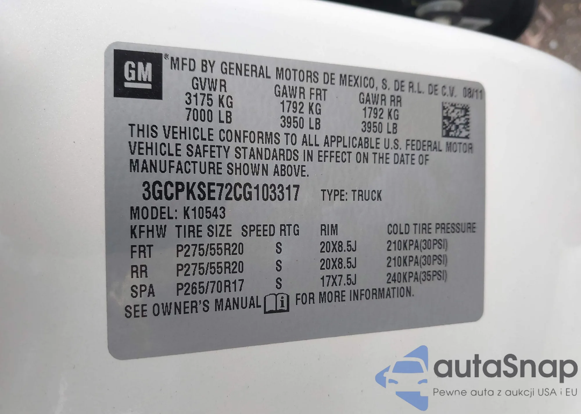 • VIN 3GCPKSE72CG103317