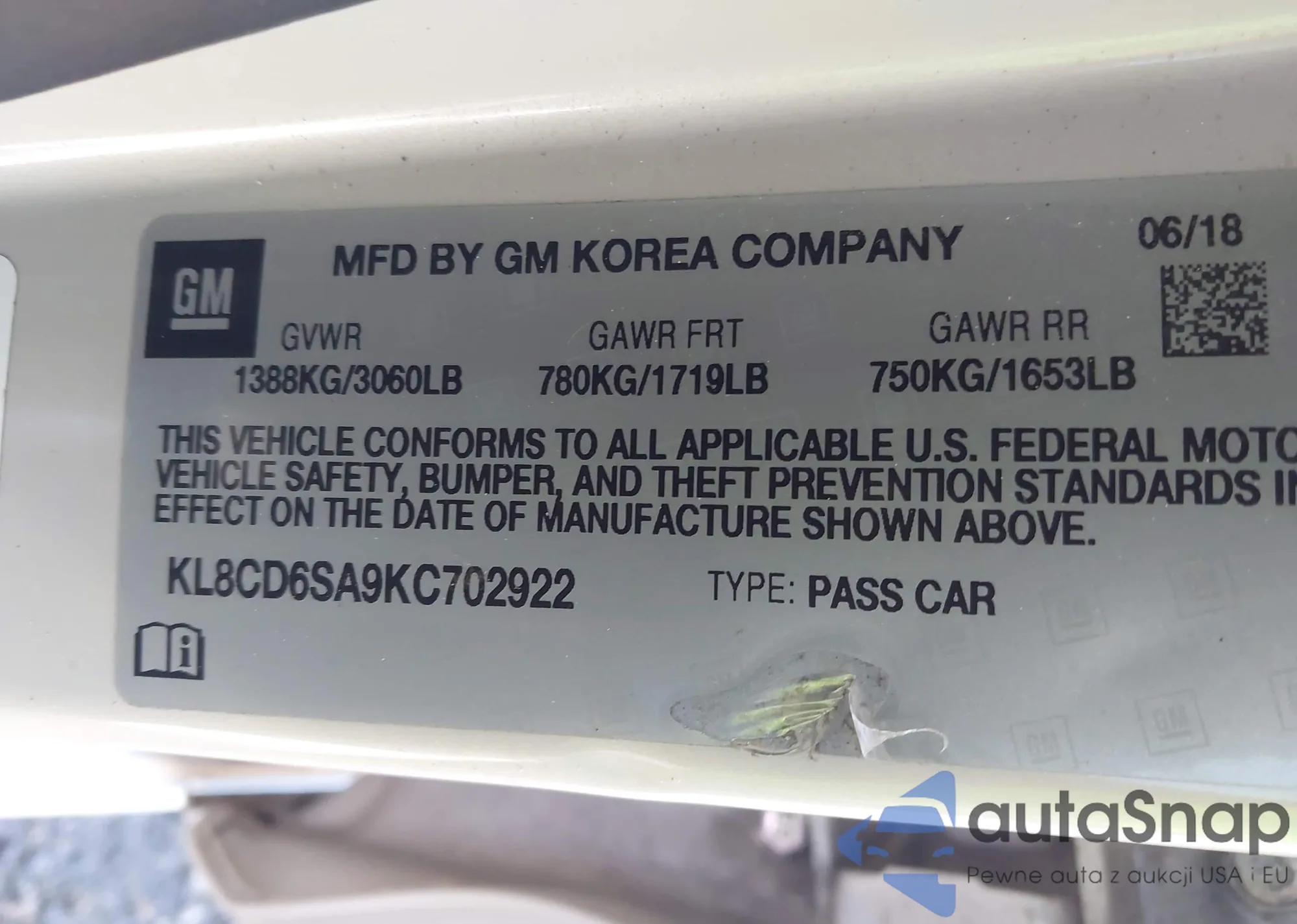 • VIN KL8CD6SA9KC702922