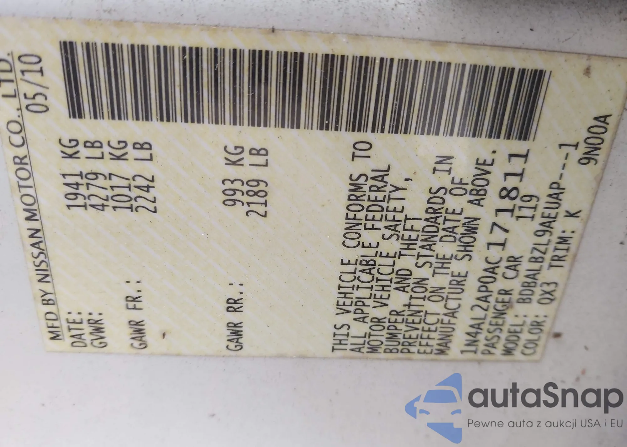 LOT: 43157210 VIN: 1N4AL2AP0AC171811