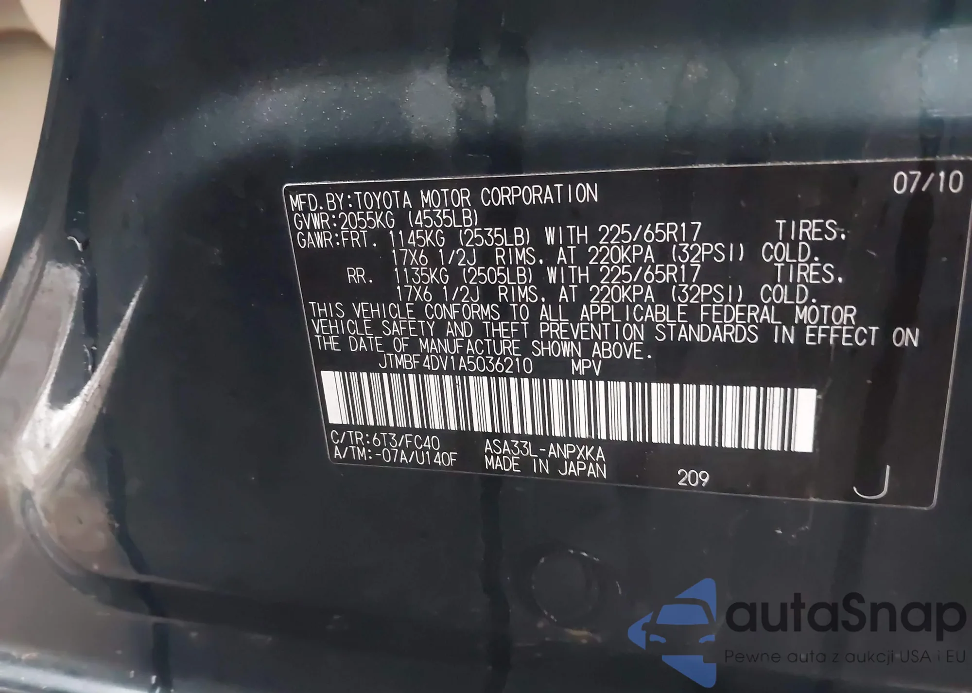 • VIN JTMBF4DV1A5036210