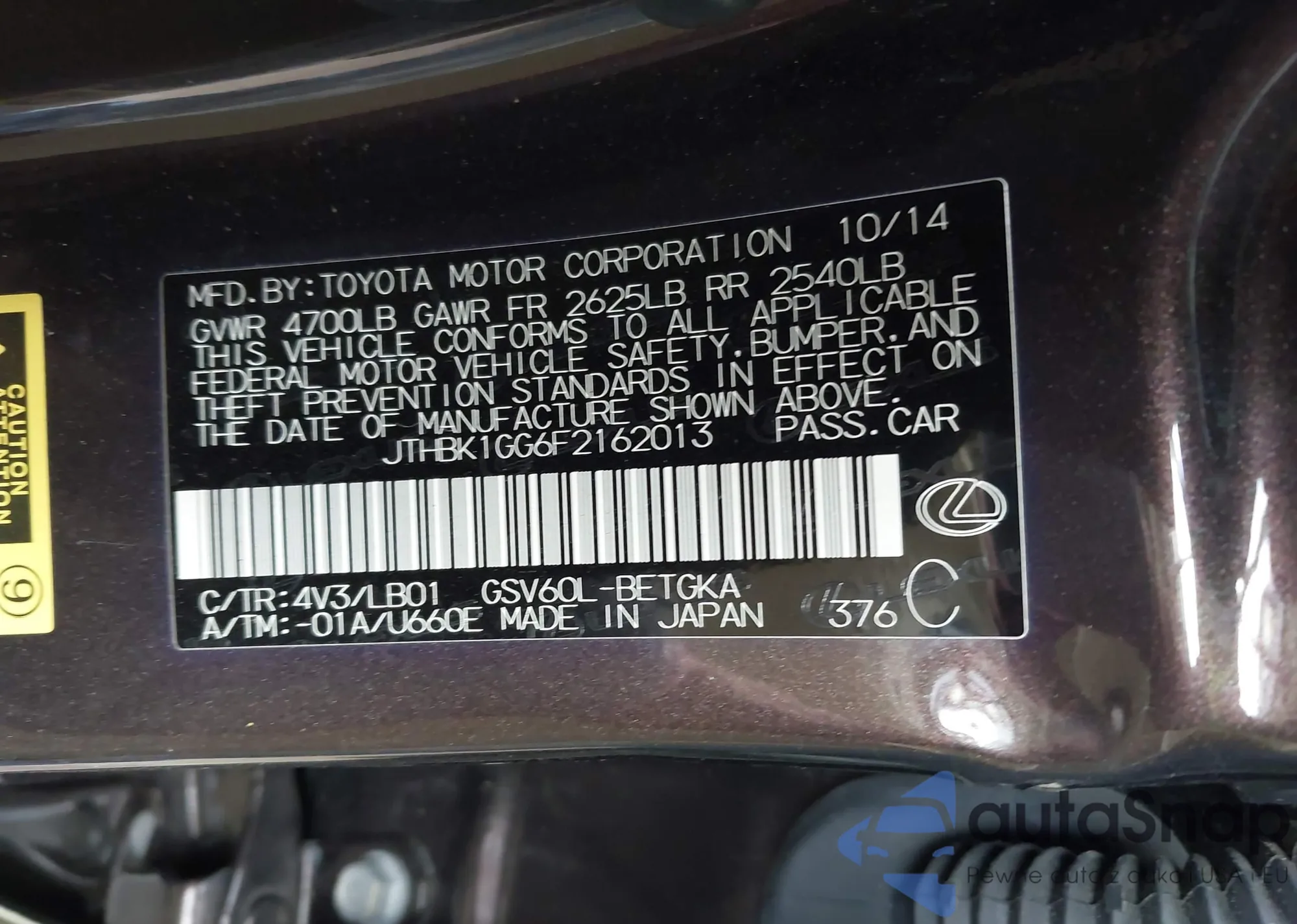 • VIN JTHBK1GG6F2162013