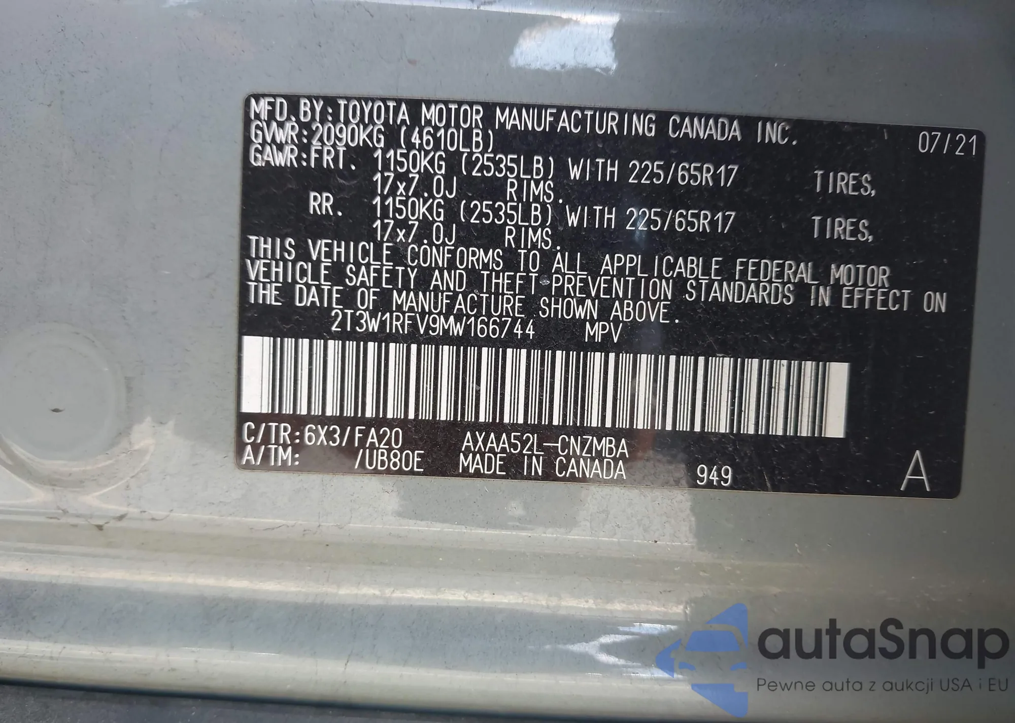 LOT: 43979027 VIN: 2T3W1RFV9MW166744