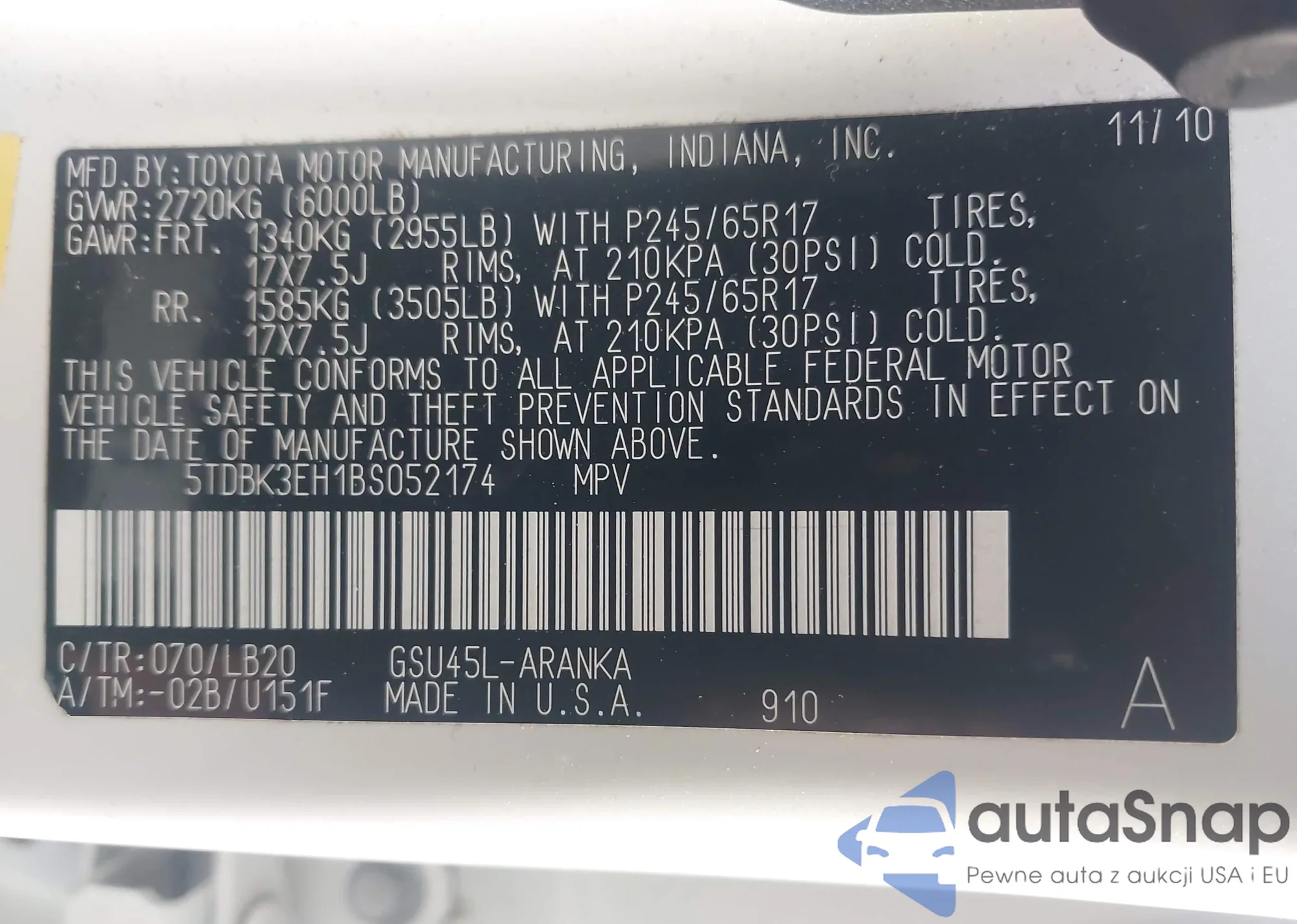 • VIN 58ABK1GG1JU080578