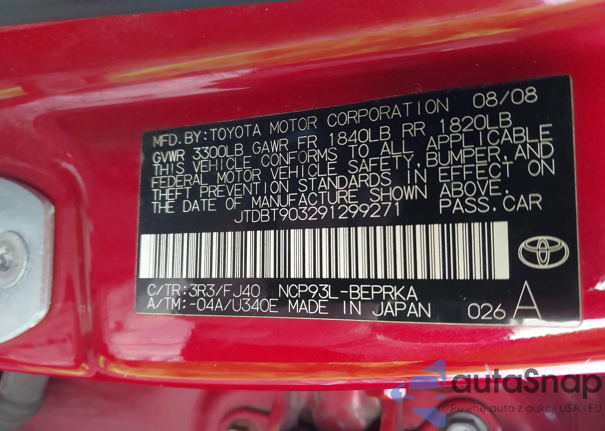 LOT: 44000462 VIN: JTDBT903291299271