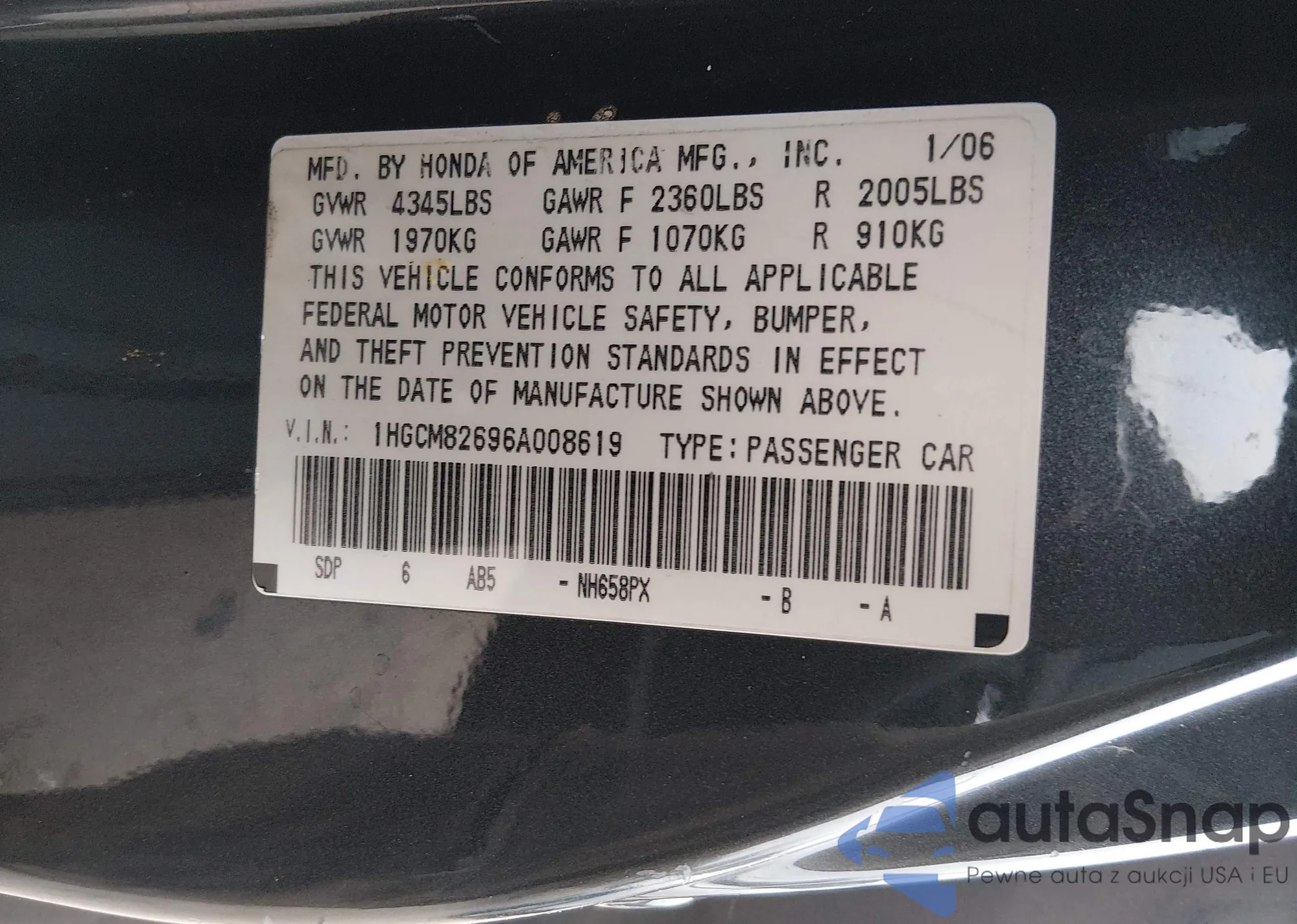 LOT: 44088112 VIN: 1HGCM82696A008619