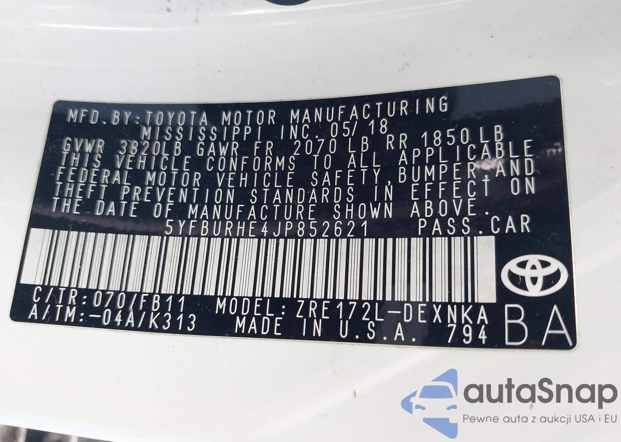 LOT: 43870482 VIN: 1FADP3K28JL208050