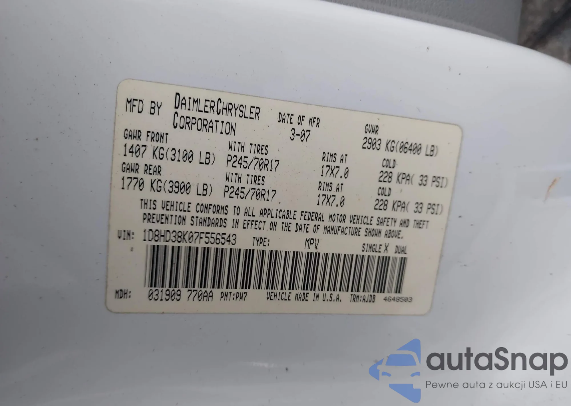• VIN 1D8HD38K07F556543