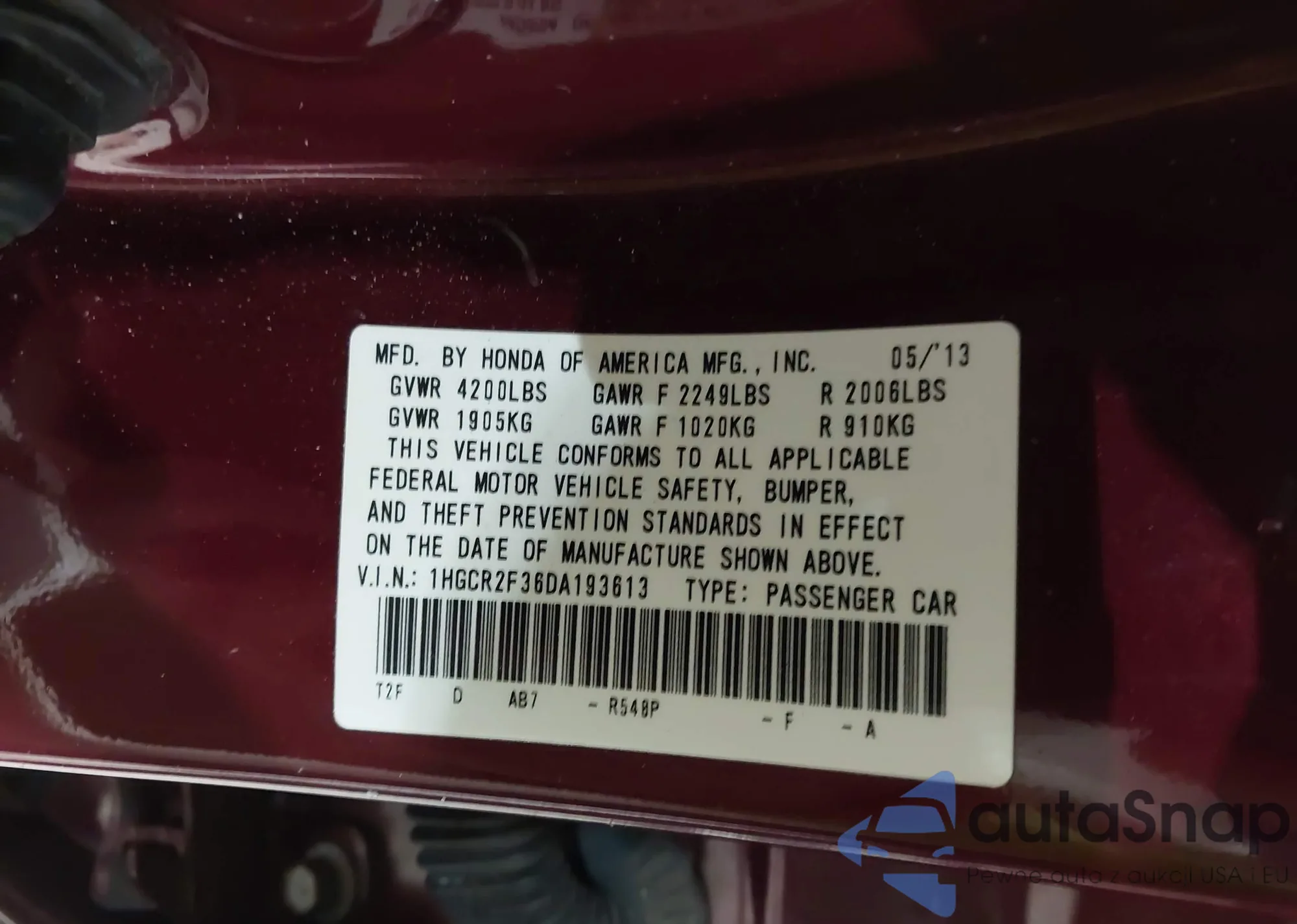 LOT: 43900307 VIN: 1HGCR2F36DA193613